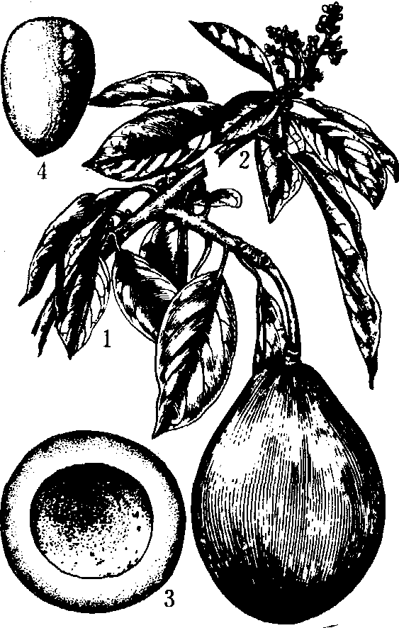 释义 | 油梨avocado,alligator pear樟科油梨(鳄梨)属常绿果树, 乔木, 中国部分地区栽培有半落叶现象。又名鳄梨、酪梨、樟梨。学名Persea ameri-cana Mill. (P. gratissima Gaertn.; P. gratissimaPax.)。 油 梨1. 果枝; 2. 花枝; 3. 果实横剖面; 4. 种子 油梨花有开闭两次的特点, 雌雄异熟。按雌雄蕊成熟时间不同分为3个类型: A型花, 第一次开花在上午, 雌蕊成熟, 柱头容授, 但花药不成熟, 中午闭合; 当天或次日下午第二次开放, 雄蕊成熟,可传粉,但柱头萎黄凋谢, 不容授。B型花, 雌雄蕊成熟期和容授性与A型花相反。交叉型花,雌雄蕊成熟期重叠,可单株结实。同一品种花型相同,但环境影响也可出现雌雄蕊成熟期重叠现象。交叉型花品种少。A型花品种或B型花品种单独种植, 或花期不同的两种花型品种混植, 都会由于未能授粉而不能结实。 年降水量1000毫米以上的热带亚热带地区,均可选适宜当地种植的品种种植。土壤深厚肥沃排灌良好的沙壤土或冲积土为最宜园地,一般要求地下水位3~5米, 忌在地下水位高的粘重土建园。 主要品种 按原产地不同分为3系:❶墨西哥系。墨西哥中部和北部高原原产, 能忍受-4.4~-6.7℃的低温, 适于亚热带地区栽培。果小、夏季成熟, 含油率较高。 ❷危地马拉系。危地马拉和墨西哥南部高地原产。-4.5℃则冻害严重,适于温暖亚热带地区种植。果实较墨西哥系略大, 含油率较低, 冬季或春季成熟。 ❸西印度系。中南美低地原产。-1℃低温会遭寒害, 适于热带地区和无霜冻的亚热带地区种植。叶大果大, 果实含油率最低, 夏季或秋季成熟。目前商品栽培品种多为这3系的杂交种, 命名品种数十个以上, 其中较优良的有富尔特(Fuerte)、哈斯(Hass)、杜克(Duke)和墨西哥拉(Mexicola)等, 成熟期、果实大小等均有差异。中国除台湾外, 多种植实生苗, 变异大, 有不少丰产优质单株, 可选作繁殖材料, 但成熟期多集中在8月至10月。 栽培技术要点 多用种子和嫁接繁殖。种子具多胚, 在种子近胚生长点部位剖开后催芽, 可增加出苗数。最好用容器育苗, 苗径粗0.8~1厘米便可嫁接,多用芽接或腹接法。苗高50~60厘米可定植, 栽植株行距5~6米。要混植花型相反而花期相同的品种方能丰产。幼树适度遮荫有利于生长, 37℃以上的高温抑制生长。沿海地区台风多, 需配防护林。花期要保持土壤湿润。嫁接苗定植3~4年或实生苗4~6年开花结果。成龄树株产25~50千克, 高产的100~150千克。果皮富光泽或摇果有响声、能浮于水面便可采收。果实有后熟过程, 熟后果肉变软。成熟果可在树上留2~3个月,在美国加利福尼亚州,Hass和Fuerte 两品种可树上留果6个月。油梨根腐病 (Phytophthora cinna-momi Rands)是最主要的毁灭性病害,要注意预防。零星种植此病少发生, 成片种植易发病。严格选种, 种子50℃处理30分钟, 用抗病砧木, 苗圃消毒, 降低果园地下水位, 防止渍水和过分荫蔽, 合理施肥, 少伤根等措施有防病效果。主要害虫有潜叶蛾、金龟子、蚜虫等。 经济价值 油梨果肉含脂肪8~30%,蛋白质1~3%,碳水化合物2~9%, 多种氨基酸的含量均约为鸡蛋的1/15,为高能低糖易消化的保健食品,尤适于糖尿病患者等病弱者食用。可鲜食, 或与糖、牛奶、咖啡等拌食, 可制色拉、饮料、冰淇淋或作面包、饼干的夹心等。油梨油可食用, 可制高级化妆品, 作机械润滑油和医药原料。经济价值较高,每吨鲜果售价800~1000美元,是有发展前途的热带亚热带水果。中国年降水量1000毫米以上、1月最低气温在0℃以上的热带亚热带地区, 可选适栽品种试种发展。 油梨avocadoPersea americana Mill.,又称鳄梨。樟科,鳄梨属。常绿乔木。为热带新兴果树之一。原产美洲热带,中国广东和福建省有引种栽培。树高达20 m,树冠广阔。叶革质,长圆披针形至椭圆披针形,先端急尖,基部宽楔至圆形。花小,两性,多数密集呈圆锥花序,着生于小枝顶端。果大型,常呈梨形、卵形或球形,黄色或黄绿色;果肉质地如奶油,橙黄色,气味芳香。种子圆形或圆锥形。以嫁接繁殖为主。果实富含脂肪,气味芳香,营养丰富,供食用,也可榨油。树形美观,可供作绿化观赏树。 油梨 油梨又名鳄梨,樟科鳄梨属常绿乔木。本属约50个种,果树栽培仅油梨1种。栽培史约100年。中国于1918年引入。树高可达20 m,叶椭圆形或卵形,长7.5 ~40 cm。圆锥花序,萼片6裂。核果梨形或卵形,长10 ~18 cm。中国南方的油梨花期3月,果熟期8~9月,生长3~4年结果。果实脂肪含量15%~20%。油梨栽培品种700多个。 油梨avocado;alligator |