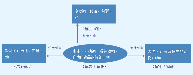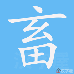 字源解说 畜,甲骨文 = (幺,丝,表示系、绑)+ (田间 的谷物 ),表示圈系动物,以谷物饲养。有的甲骨文 用 代替 ,表示用嫩草 饲养动物。造字本义:将动物系在栏圈里,用谷物或嫩草饲养,以备家庭对肉食的不时之需。金文 承续甲骨文字形。有的金文 将“幺” 误写成“玄” 。篆文 承续金文字形。用以敬神的鲜活动物叫“牲”,用以养人的鲜活动物叫“畜”;后“牲”与“畜”并用为“牲畜”。 附 文言版《説文解字》:畜,田畜也。《淮南子》曰:“玄田爲畜。” ,《魯郊禮》畜从田、从兹。兹,益也。 附 白话版《说文解字》:畜,耕田的力畜。《淮南子》上说:“玄、田会义即为‘畜’字”。 ,《鲁郊礼》上说,“畜”字由田、兹会义。兹,表示增加。 引申线索