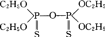 治螟磷sulfotep又称治螟灵、硫特普、苏化203。广谱、高毒有机磷杀虫剂。化学名称:O,O,O′,O′-四乙基二硫逐焦磷酸酯。化学结构式如左。纯品为淡黄色、可流动的液体,沸点136~139℃(266.6 Pa),20℃时蒸气压为226.6×10-4Pa,密度1.196。室温下在水中的溶解度为25 mg/kg,可与大多数有机溶剂混溶。在酸性和中性溶液中稳定,遇强碱性物质分解。对害虫具有强烈的触杀作用,兼具胃毒和熏蒸作用。主要用于防治水稻、棉花等作物上的三化螟、二化螟、纵卷叶螟、叶蝉、飞虱、蚜及螨类,对钉螺、蚂蟥也有很强的毒力。对大鼠急性口服LD50为7~10 mg/kg,兔急性经皮LD50为20 mg/kg。由于对人、畜有高毒,已被其他有机磷杀虫剂取代。