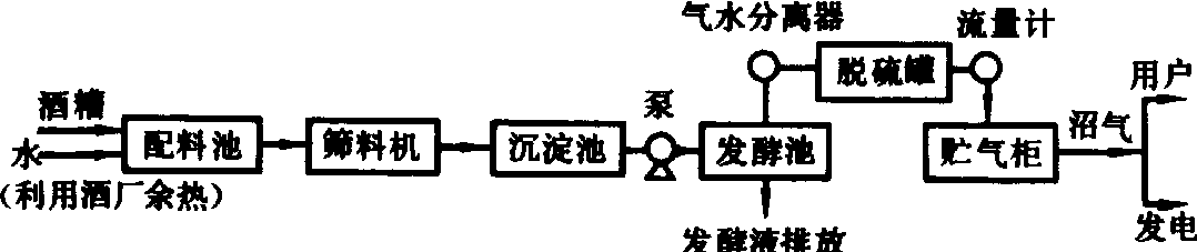 图8 两阶段沼气发酵工艺 干发酵工艺 以固体有机废物为原料,在少水条件下进行厌氧消化的一种工艺。1980年康奈尔大学根据美国能源部的要求首先进行了干发酵研究,用来处理农业废弃物或城市挥发性固体有机物。干发酵的干物质含量在20%左右较为适宜,干物质含量超过30%则产气量明显下降(图9)。由于干发酵时水分少,所生成的挥发酸得不到稀释,挥发酸的积累常引起pH值的严重下降,导致发酵原料酸化,沼气发酵停止。为了克服pH值的下降,常用方法有:❶加大接种物用量,使酸化和甲烷化速度能尽快达到平衡,一般接种物用量应为原料的30%; ❷增加高含氮原料用量,如人畜粪便等,以降低C:N比值,使原料在分解时所产生的挥发酸能被其所产生的氮中和; ❸将原料进行堆沤,使易于产酸的有机物质被氧化分解掉一部分。由于堆沤会造成料的浪费,所以在生产上应首先考虑采用前两种措施,中国山东省能源研究所的应用研究表明,采用批量投料发酵进行120天后,纤维素降解了53.5%,脂肪降解了45.9%,总碳消耗为34.68%,平均每千克干物质产气量为216.7升;在平均温度为26.7℃条件下,产气率平均为0.298立方米/立方米·天。干发酵要求便于进出原料,半塑式沼气池适用于干发酵工艺(图10)。 图9 不同干物质含量沼气发酵产气曲线 图10 半塑式沼气池示意 填埋厌氧消化工艺 利用自然沟壑大规模埋放城市有机垃圾并从中抽取沼气的一种厌氧处理工艺,填埋技术无论是从环境或是能源两方面来看,对今天的社会都具有非常重要的意义。方法是对填埋场地基进行处理,多采用铺设粘土,以防止渗出液渗入地下,将填埋场表面用粘土覆盖并种植花卉,以防止气味扩散。在填埋场垃圾内埋设带有滤孔的管道,用泵将沼气抽出,经净化处理后送给工厂或并入天然气管网,便能防止所产沼气四处横溢引起的爆炸(图11)。为了加速沼气的生成,在堆积垃圾时加入5%的清化污泥接种物和营养物质。加入污泥的填埋后第二年产气最多。三年累计产气量为0.095立方米/千克干物质,甲烷产量为0.051立方米/千克干物质。 图11填埋示意图 沼气发酵工艺都是为了满足不同原料在较短时间内使用机质得以更快地降解。产甲烷菌的生长和繁殖速度以及较快地从物料取得营养物和能量是完成上述要求的关键。工艺的选择决定于物料和具体条件。除上述工艺外,还有生物转盘工艺,折流沉淀工艺,以及连续发酵塞流工艺等。 为了提高消化率和去除率,各类工艺可相互串联使用,如上流式污泥床和滤器相结合,厌氧发酵和好氧发酵相结合等。可采用单级发酵工艺或两级和多级发酵工艺。后者有机物滞留期长,分解较彻底,但投资较高。 沼气发酵过程中,有机物的分解和产气温度有密切关系,温度高时,微生物活跃,分解消化快,产气高。因此通常也以不同发酵温度区分为高温发酵(50~60℃),中温发酵(30~35℃)和常温(环境温度)发酵工艺。 不同原料由投入经发酵至最后排出沼渣的整个过程中所采用的不同技术和方法的措施,组成了某一特定的流程,称之为工艺流程,通常以框图表示。此流程图表示了应采用的各类设备,是设计沼气工程的技术依据,也是经济评价的根据。下面是一个酒厂处理酒糟的工艺流程图: 沼气发酵工艺从发酵原料准备开始到产出沼气的整个过程采用的技术路线和方法。主要有原料的收集和预处理,接种物的选择和富集,沼气发酵装置的启动,日常管理及其他技术措施。工艺类型按投料连续性分为批量投料、半连续投料和连续投料;按温度不同分为中温发酵、高温发酵和常温发酵;按发酵器的阶段性分为一步发酵和两步发酵;按发酵液流经发酵器的多少分为单级发酵和多级发酵;按发酵原料含水量的不同,分为液体发酵和干发酵;按发酵器类型不同分为常规消化器(沼气池)、高速消化器、厌氧接触工艺、厌氧滤器、上流式厌氧污泥床等。 |