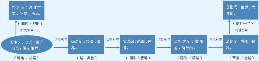 字源解说 “各”是“略”的本字。当“各”的“进犯”本义消失后,金文 再加“田”(“疆”的省略)另造“略”代替。金文 = (田,即“疆”,边界)+ (各,进犯他邑),表示犯边。造字本义:侵入他邑,重定疆界。篆文 承续金文字形。古人称武力掠财为“侵”* ,称武力占地为“略”。 附 文言版《説文解字》:略,經略土地也。从田,各聲。 附 白话版《说文解字》:略,管理侵占的土地。字形采用“田”作边旁,采用“各”作声旁。 引申线索
