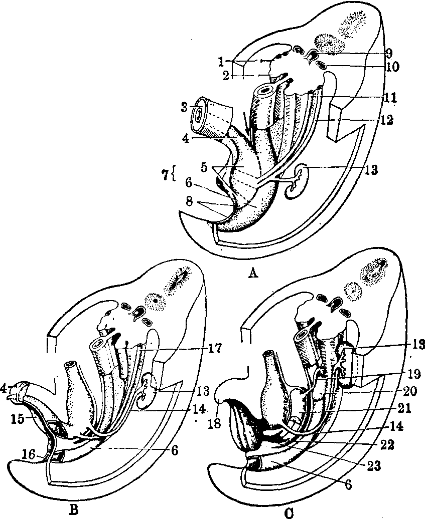 释义 | 泄殖腔的分隔与演变 泄殖腔的分隔与演变泄殖腔是后肠末端膨大的部分。它的腹侧与尿囊相连,背面两侧接受中肾管通入,末端细长,为暂时的尾肠。泄殖腔的腹侧壁内胚层直接与体壁外胚层相贴连,形成由内、外两胚层构成的泄殖腔膜或称泄殖腔板。此膜在人胚第3周初已出现于胚盘中线尾侧。4周时,随着胚胎尾部的生长,泄殖腔膜由胚盘的尾侧转至胚体的腹侧,以后由于中胚层细胞逐渐扩生至泄殖腔膜周围的内、外胚层之间,使泄殖腔膜的范围变小。同时环绕此膜周围的组织生长较快,形成三个小突起,一个位于中线,介于脐与泄殖腔膜之间,称为生殖结节,两个分别位于膜的两侧,称为生殖褶襞。生殖褶之间为尿道沟。 人胚泄殖腔的分隔及演变 A.性别未分化期(6周人胚) B.分化为男性的尿生殖系统 C.分化为女性的尿生殖系统 1.中肾 2.生殖腺 3.脐带 4.尿囊柄 5.尿生殖窦 6.直肠 7.泄殖腔 8.尿生殖膜 9.背主动脉 10.后主静脉 11.旁中肾管 12.中肾管13.后肾 14.阴茎 15.尿道沟 16.肛门 17.输精管 18.阴蒂 19.输卵管 20.卵巢 21.子宫22.子宫颈 23.阴道 膀胱和尿道的发生 原始尿生殖窦由头侧向尾侧分为三部分,即膀胱部、盆部和初阴部。膀胱部膨大,以后分化为膀胱,其顶端与尿囊相连。尿囊以后退化变为脐尿管,其管腔在胚胎后期封闭形成纤维束,使膀胱顶端连于脐。出生后,此纤维束由于膀胱下降而加长,成为脐中韧带。 中肾管与输尿管芽共同的总排泄管通入膀胱的后壁。随着膀胱的逐渐扩大,总排泄管被吸收成为膀胱后壁。因此,中肾管和输尿管也分别开口于膀胱。由于膀胱后壁进一步生长,输尿管开口相对的移到膀胱头侧,而中肾管开口则移至尾侧,彼此并排开口于尿道前列腺部。由于总排泄管来源于中胚层,被吸收后形成的膀胱三角上皮便成为膀胱中唯一的中胚层区,有谓此区在男性达到尿道前列腺上部; 在女性则占尿道的上2/3 (Richard与Snell,1972)。但是,(Gyllensten,1949)指出膀胱三角的中胚层上皮以后被来源于内胚层的膀胱上皮所代替。人胚第3月时,膀胱壁外的间充质开始分化为平滑肌及结缔组织。第4月形成成体膀胱壁的分层状态。 尿生殖窦的盆部,在男性演变为尿道前列腺部和膜部。在女性演变为连接膀胱的永久尿道的大部分。胚胎3月末,男性尿道前列腺部的上皮增生,长出一些芽泡伸入周围间充质内,分化发育为前列腺,女性尿道的头侧段也以同样方式发生形成女性尿道旁腺体。 初阴部或称真尿生殖窦,在男性发育为尿道阴茎部的大部分。在女性,尿生殖窦的初阴部发生为尿道的下段,以下部分则加宽变浅,当尿生殖窦膜破裂后,与尿道沟共同形成阴道前庭。 ☚ 肾的发生 泄殖腔畸形 ☛ |