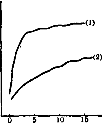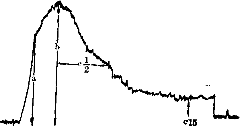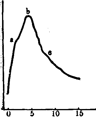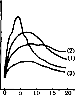 (2)梗阻性肾图。影响尿液自肾盂、输尿管的排泄,就能出现梗阻性肾图。这类肾图首先是c段下降迟缓,c1/2大于8分钟,此时a、b段可能没有明显改变。梗阻较严重时,仍能有一定量的尿液排泄,此时c段平齐或稍有上升。严重梗阻时,标记物在肾脏内潴留,肾图的c段不下降反而上升(图)。凡梗阻严重,病期较长,在出现梗阻性肾图的同时,也有缺血的肾图表现。