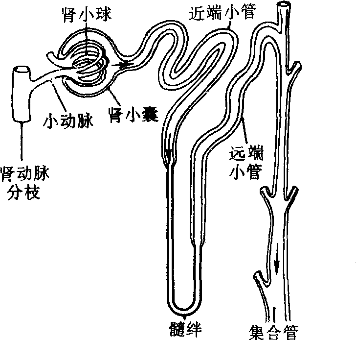 释义 | 泌尿系统的结构 泌尿系统的结构泌尿系统是由肾脏、输尿管、膀胱和尿道组成的。肾脏有一对,呈蚕豆形,位于后腹壁脊柱两侧(见图1.8-1)。其纵切面可区分为三个区域(见图1.8-2),由外向内分别为皮质、髓质和肾盂,肾盂向下移行于输尿管。肾单位(见图1.8-3)是肾脏的基本功能单位。人的两侧肾脏约有170—240万个肾单位。每个肾单位包括肾小体和肾小管两部分。肾小体由肾小球和肾小囊构成,肾小球为一团毛细血管网,其两端分别与入球小动脉和出球小动脉相连。肾小球的包囊即肾小囊,它有两层上皮细胞,内层(脏层)紧贴在毛细血管壁上,外层(壁层)与肾小管壁相连,两层上皮之间的间隙称为囊腔,与肾小管腔相通。肾小管全长分为三段: 图1.8-1 泌尿系统及其血液供应 图1.8-2 肾脏纵剖面 图1.8-3 肾脏纵剖面 ☚ 1.8 泌尿系统 尿生成过程 ☛ |