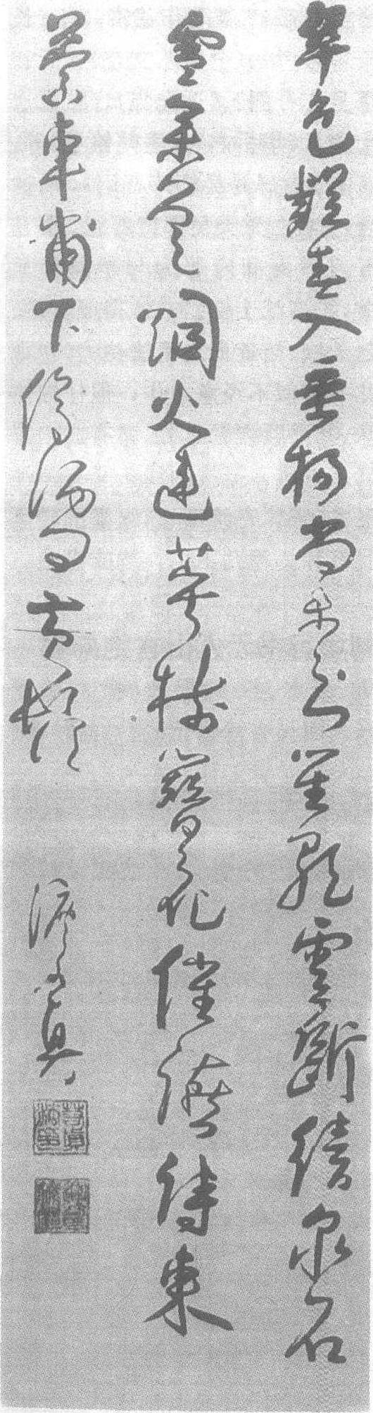 清。绫本。纵172.5厘米,横44.6厘米。四川省博物馆藏。法若真(明万历四十一年—清康熙三十五年,即公元1613—1696年),字汉儒,号黄石,亦号黄山,山东胶州人。顺治三年进士,官安徽布政使,康熙十八年举博学鸿词。工诗文,善书画,精擘窠大字,雅善山水,自成一家。清李集《鹤征录》云:“若真以巨幅大书司马温公禅偈见贻,笔势飞动。盖先生少以诗名,书画则其余事耳。”著有《黄山诗留》。此五言诗:“翠色疑春入,垂杨尚未知,笙歌云断续,泉石雪参差。烟火连□树,簪花催燕诗,东蒙车甫下,停酒问黄须。”款署:“法若真”,款下钤朱文:〈法若真印〉、〈运筹帷幄〉两印。书体得王铎之书风,涨墨淋漓,行笔朴茂,任笔迅疾,遒劲多姿中流以娟秀、飘逸的韵律,流畅、静穆、潇洒自然,而独具风格。