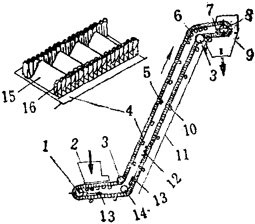 用波形挡边胶带作为输送带的带式输送机。以通用胶带输送机的零部件为基础发展而成,其牵引构件和承载构件为带有波形挡边和横隔板的波形挡边胶带,由波形挡边、横隔板及胶带体构成一个个盛装物料的“无盖容器”。在水平段,“容器”底部就是承载物料的输送带,在垂直段,“容器”的底部为横隔板。这种输送机既可在水平方向又可在垂直方向或任意角度下输送物料而无须转载,同时保持着胶带输送机运动平稳、速度快、生产率高、能耗低等优点,又能利用通用胶带输送机的零部件,所以它日益得到广泛应用。如图示。