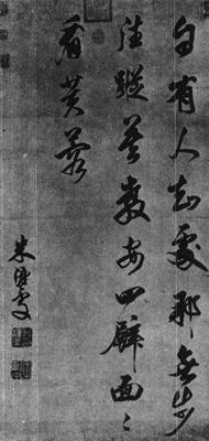 【赏析】: 苏东坡曾云:“大字难于结密而无间,小字难于宽绰而有余。”这件不算小的条幅,每字结构没有松散的毛病,却有尺牍书的体势,点画比较精到,字裏行间充盈著醇雅的书卷气息,行草参半而相杂,显得较爲自然,最后一行“看芙蓉”三字尤爲精采。 米汉雯是米万锺之孙,与其祖亦有“大小米”之称。汪琬《说铨》谓:“紫来(汉雯字)书书皆工秀,书法学米南宫,径寸外尤劲媚。或评之曰:紫来天才超诣,当在友石先生(万锺号)之上。”这个说法还比较公允。他的书法仍称米家传统,书中“有”、“踪”、“面”三字依稀得其风神,“面”字转折一笔提顿颇爲逼似。但毕竟与米芾“沉著痛快”的长处相去甚远,“处”、“那”、“壁”三字不仅结字殊劣,而且悬针一笔中怯,露出“底气”的不足。这也难怪,老米那种控制笔墨的绝活到他儿子米友仁那儿尙且不传,又何必深责米汉雯呢? |