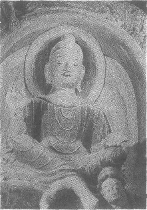 北凉。高125厘米。甘肃省张掖县金塔寺石窟东窟中心柱西面二层中龛内佛像。弥勒为梵文的音译。据《弥勒上生经》和《弥勒下生经》等记载,弥勒生于婆罗门家庭,后为佛弟子,居于兜率天,经四千岁当下生人间,继释迦牟尼之位而成佛。这尊佛像面形丰润,五官塑造柔和,特别是双耳给人以温软之感。墨彩描眉,红彩点唇,表情十分平和。身披通肩袈裟,衣纹舒展,交脚坐于台上,作施无畏印,其风格具有早期造像的代表性。