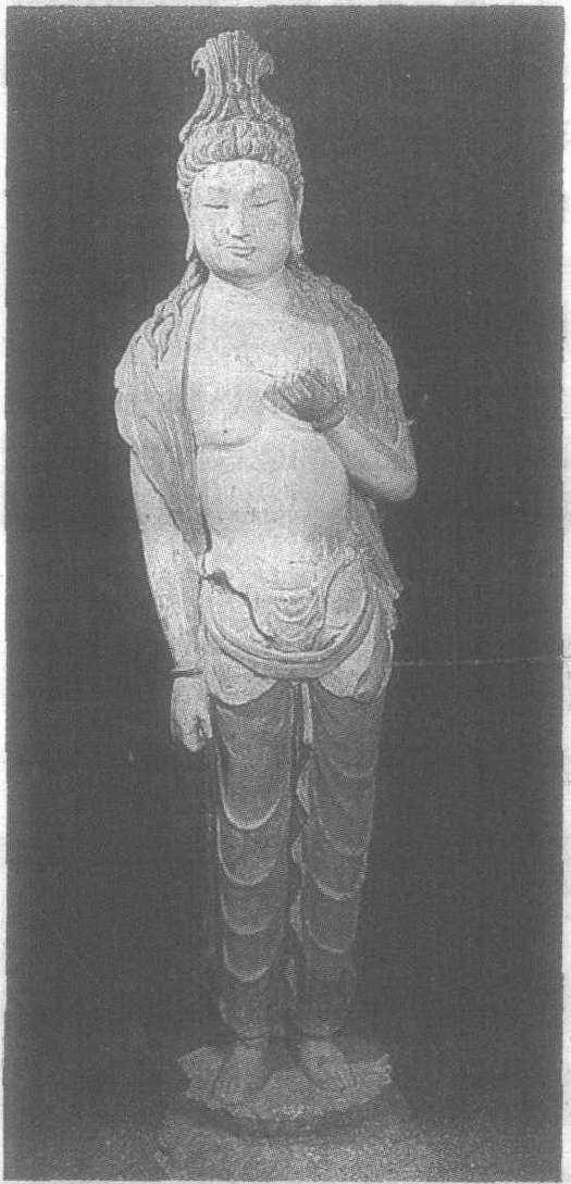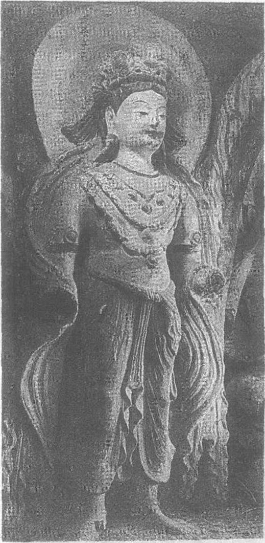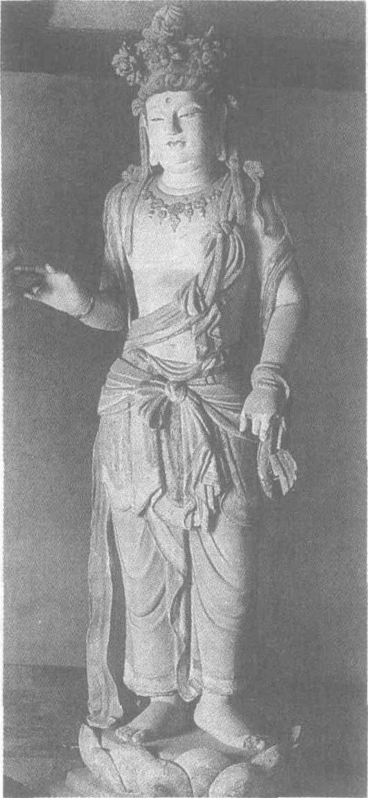 释义 | 泥塑菩萨像 泥塑菩萨像唐建中三年(公元782年)。通座高258厘米。山西省五台山南禅寺大殿内塑像。此菩萨在佛坛的左侧,赤足立于圆形莲台之上,头戴漂亮的花冠,胸佩精细的璎珞,上身袒露,长巾缠绕于双肩及双臂。腰间的天衣及长裙衣纹翻叠转折,清晰而自然。腰微扭,体呈“S”形,形体十分健壮。其面相圆如满月,眉似弯柳,双目柔情似水,口若含樱,妩媚娴雅而不失庄重的本色,是具有唐代典型风格的作品。南禅寺见“南禅寺正殿”条目。 ☚ 石雕迦叶、阿难立像 彩塑天王立像 ☛ 泥塑菩萨像 泥塑菩萨像北凉。高135厘米。甘肃省张掖县金塔寺西窟中心柱东面下层龛外北侧塑像。头戴高宝冠,上身裸露,胸前缀满璎珞。质料具有轻薄之感的长裙系于腰间,裙紧贴双腿,显露出优美的曲线。肩披长巾自双肩绕下,迎风飞扬,飘逸潇洒。菩萨面形秀丽,五官灵巧,给人以纤柔之感。但其眉宇间又透出一股英气,外柔内刚,令人肃然起敬。 ☚ 泥塑弥勒佛像 飞天图壁画 ☛ 泥塑菩萨像 泥塑菩萨像唐。高180厘米。甘肃省凉州天梯山三窟塑像。甘肃省博物馆藏。菩萨发髻高耸,发丝毕露。上身裸露,披巾搭肩垂至臂旁。下着红裙,似丝绸类薄料,紧贴双腿,有如当今流行的裙裤,衣折如流水般自然。肌肉丰满,身材匀称,站立呈“S”形。面目的塑造极少宗教意味,而更似一般的民间妇女。双手柔嫩,皮肤的质感很强,浑身上下充满女性的魅力,极具唐代雕塑的艺术特色。 ☚ 弥勒菩萨像壁画 泥塑佛像 ☛ |