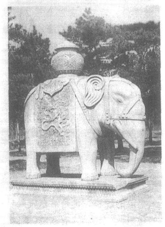 清。高约3.3米。河北省易县清西陵泰陵(雍正皇帝陵墓)神道石像生。白石雕成。象头戴笼头,身驮宝瓶,披长鞍。头微垂着,长鼻触地后内卷,安立于雕满莲瓣纹的须弥座上。此象高大雄伟,沉稳如山,温顺安宁,给人以平和之感。象驮宝瓶被称作“太平有象”,用以象征“天下太平”。清西陵见“清西陵”条目。