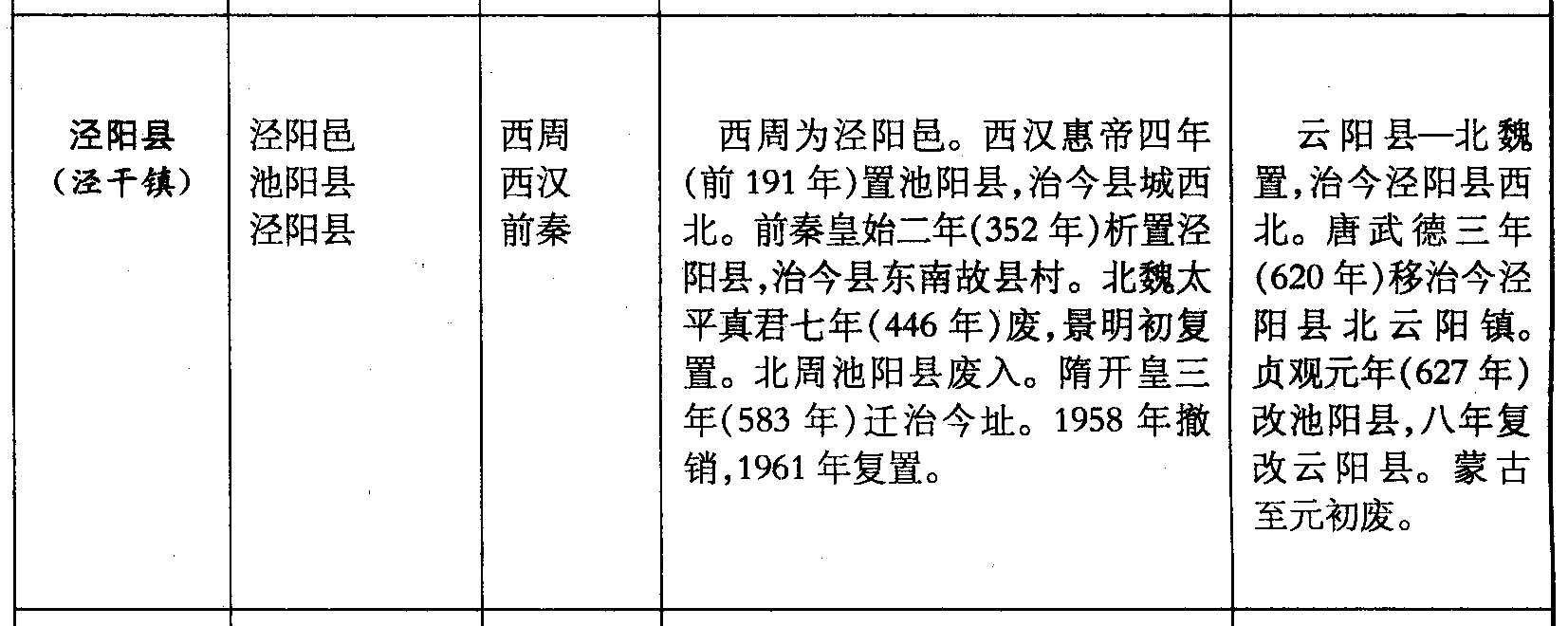泾阳县(泾干镇)泾阳邑池阳县泾阳县西周西汉前秦西周为泾阳邑。西汉惠帝四年(前191年)置池阳县,治今县城西北。前秦皇始二年(352年)析置泾阳县,治今县东南故县村。北魏太平真君七年(446年)废,景明初复置。北周池阳县废入。隋开皇三年(583年)迁治今址。1958年撤销,1961年复置。云阳县—北魏置,治今泾阳县西北。唐武德三年(620年)移治今泾阳县北云阳镇。贞观元年(627年)改池阳县,八年复改云阳县。蒙古至元初废。