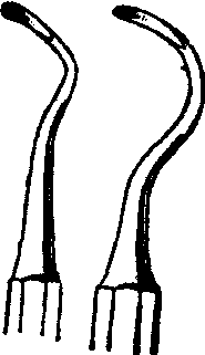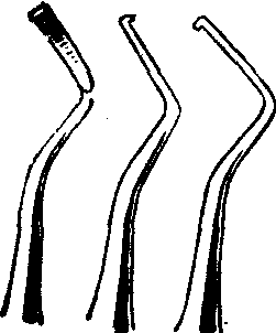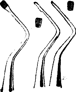 刮治器械 ❶匙形刮治器:是比较细致而锋利的器械,其两侧边缘均为细窄而较长的刀刃,腹面形似匙状凹面,而背面圆突,腹面和背面于两侧边缘相交则成刀刃;刀刃同杆的角度设计为便于达到口腔内所有区域,用以刮除牙根面上的龈下牙石。匙形刮治器分前牙和后牙两种,前牙匙形器一对,弯度较小;后牙匙形器一对,弯度较大,一适用于颊侧,一适用于舌侧。使用时,刀刃伸入袋内与牙面所成夹角应小于90°,当刀刃达到袋底时,恰在龈下牙石之下,用手指动作的拉力将牙石从根面刮出;刮治颊舌侧时,可将刃头指向根尖,刀刃对着根面,顺远近中向刮除。这种器械的另一用途是刮光根面并刮除袋壁及袋底软组织(图3)。 ❷锄形刮治器:这种器械与锄形洁治器不同,刃口与杆成为大于90°的角度,并且有不同的方向,如向左、向右、向前、向后; 刃口背面是圆钝的,便于伸向袋底深处,而不伤软组织。在颊、舌、远中、近中各面都可达到深牙周袋,从而刮除残余牙石和软化牙骨质,并可刨光牙面(图4)。 ❸锉形刮治器: 其角度和刀刃方向等,基本上与锄形刮治器相同,只不过整个刀刃都为锯齿,作为锉光根面之用,使用时只能用手指动作的拉力(图5)。