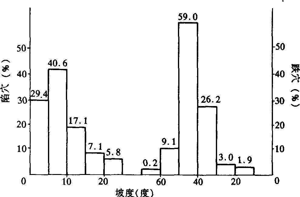 发育条件 土层深厚易蚀,土体内多垂直裂隙和孔洞; 汇集地表径流的浅洼地,或具有加剧径流冲刷力的陡坡、陡壁以及暴雨等均为洞穴侵蚀发育的主导因素。不同类型的洞穴其发育的坡形不同。在黄土高原区陷穴以凹形和凸凹形坡为主,竖井陷穴集中发育于塬畔,阶地和梯田等坡面转缓的低洼部位,坡度较小,多在10°以下。漏斗形可见于直形坡,坡度小于20°。跌穴主要发育于直形坡,或切沟和悬沟的沟床,穴道发育部位的坡度以35°~45°最多(见图2)。按洞穴发育部位可见,地形切割破碎程度越大,越易形成洞穴; 洞穴侵蚀的发育,又导致地形愈加破碎。土体中的垂直裂隙发育,可蚀性高并具一定塑性,是陷穴发育的重要条件。土体砂性大,裂隙不甚发育,可蚀性高且塑性小,则难形成陷穴,但可发生跌穴。洞穴的发育还与雨型有关。高强度短历时暴雨,径流汇集,冲刷力大,易发育跌穴,促进沟蚀; 长历时强度不大的降雨,利于下渗,易发育形成陷穴。此外,动物孔洞,植物腐根及修筑梯田时填土部位的疏松层,均是促使洞穴侵蚀发生的潜在因素。 地理分布 洞穴侵蚀在中国黄土高原分布最为广泛;在美国西部、澳大利亚东南部、新西兰、土耳其和南非等地亦有分布。其分布区域的气候和下垫面条件与中国大致类同。年降雨量500~700毫米,干湿季节交替明显,夏秋多暴雨。地面组成物质以松散的残积物或第四纪土状堆积物为主,土体中裂隙较发育,颗粒组成中粉粒含量高。黄土高原的洞穴侵蚀呈现自南向北,自东向西逐渐增强的趋势。最发育地带大致沿沙黄土南缘降雨量450~550毫米,其六盘山以西及陇东塬区陷穴比较发育,陕北丘陵区,跌穴比较发育。 危害和防治 洞穴侵蚀是加速沟头前进、沟床下切的重要侵蚀方式,并促使地面切割愈加破碎。出现在梯田、道路和居民窑洞的洞穴侵蚀,常导致这些设施被毁坏,甚至出现窑洞倒塌和人畜伤亡。在黄土塬区因洞穴侵蚀,一次暴雨沟头可前进40多米。梯田洞穴的次暴雨侵蚀量每平方公里可达6300吨/平方公里·年。