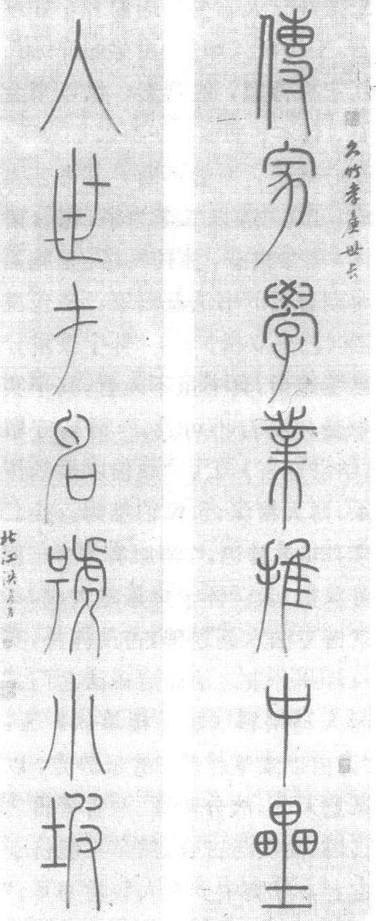 清。纸本。纵132.5厘米,横26.2厘米。四川省博物馆藏。洪亮吉(乾隆十一年一嘉靖十四年,即公元1746—1809年),字稚存,号北江,又号更生居士。江苏阳湖人。乾隆庚戌,即公元1790年榜眼,官编修,督学贵州。以诗文擅名,经史注疏、《说文》地理,靡不参稽钩贯。工篆书。著有《北江全集》。《清史稿》卷三百五十六有传。此篆书七言联句:“传家学业推中垒,人世才名号小坡。”款署:“北江洪亮吉”,下钤<更生居士)、<洪亮吉学书印>二方印。书体工稳遒丽,字形圆转灵妙,线条挺劲圆润,不失为篆书名作。联句中“中垒”指刘向,“小坡”谓苏过。