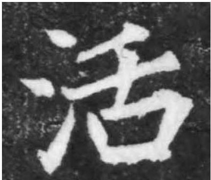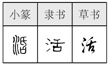 形声,小篆从水, (ɡuā)声,隶定为“活”。本义读ɡuō,拟声词,水流动的声音;又读huó,引申为流动、活动、不固定的、不死板等,假借为生存,由此引申为使生存、工作(一般指体力劳动)等。 【辨析】 以“活”作音符构成的形声字一般读kuò:阔。 |