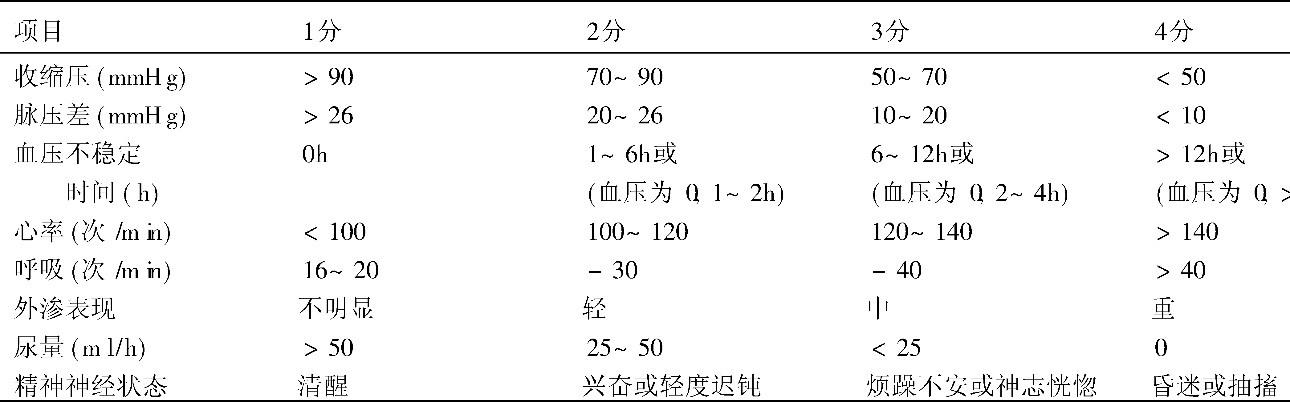 释义 | 流行性出血热难治性休克记分诊断法 流行性出血热难治性休克记分诊断法refractory shock count score diagnose of epidemic hemorrhagic fever流行性出血热难治性休克记分诊断法 诊断标准:总分>16分。总分≥20分:难治性休克。总分≥30分:往往死亡。说明:对某一时间(低血压或休克出现后4h或8h)内的临床表现,以最坏情况时的资料记分;如有几次血压则取最低值,而心率则取最高值,有严重心律失常或心力衰竭者记4分;呼吸衰竭记4分;外渗表现,球结膜轻度水肿属“轻”;球结膜明显水肿,眼睑浮肿属“中”;颜面或全身浮肿,或有胸水、腹水或球结膜高度水肿属“重”。 ☚ 流行性出血热早期定度标准 恐水征 ☛ |