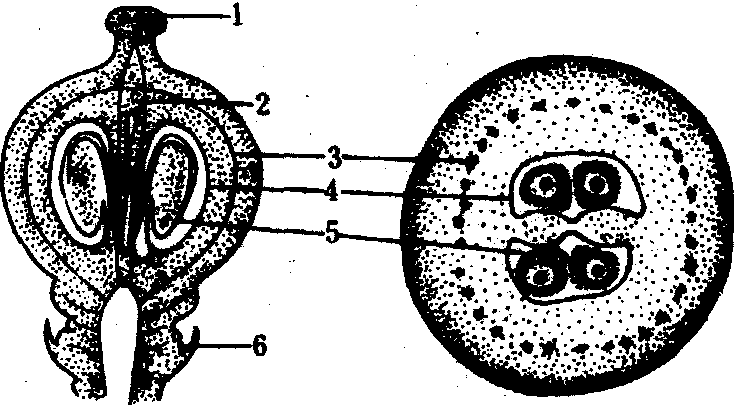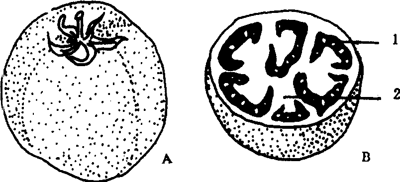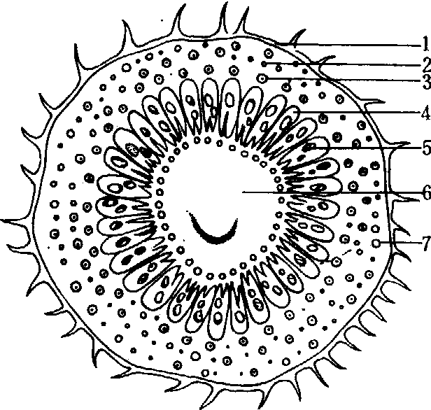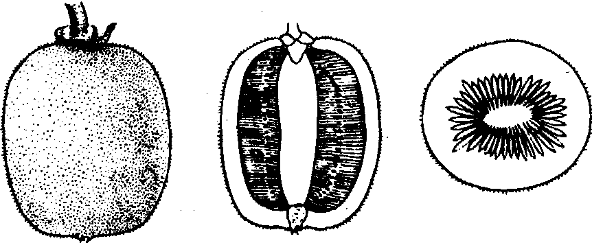 释义 | 浆果jiāngɡuǒ液果类果实,中果皮和内果皮肉质多汁,如葡萄、西红柿等。 浆果jiāngguǒ〈名〉液果的一种,果皮和内果皮都是肉质,水分很多,如葡萄、龙眼等。 浆果jiāng guǒ液果的一种。1906年《博物学教科书》第一编:“浆果: 外果皮为表面为表皮,而内果皮及中果皮俱为浆质,内悬多数之种子,葡萄、柿等属之。”1908年《最新农业教科书》卷四:“浆果谓葡萄、无花果、木半夏、莓等。”1939年Teh-Ching Leo,Cousland's English-Chinese Medical Lexicon:“berry,浆果。” 浆果berry由子房或联合其他花器发育成柔软多汁的肉质果。浆果类果树种类很多, 如葡萄、猕猴桃、草莓、树莓、醋栗、越橘、果桑、无花果、石榴、杨桃、人心果、番木瓜、番石榴、蒲桃、西番莲等。充分成熟的柿果, 柔软多汁; 拐枣(枳椇)膨大多汁的花轴、果柄、也有称之为浆果。 图 1 葡萄果粒的内部构造 左. 纵切面; 右. 横切面 1. 柱头底; 2. 果心维管束; 3. 维管束环4. 果心; 5. 种子; 6. 果蒂 葡萄的果实构造(图1)。果皮最外是一层表皮细胞,致密而光滑, 上覆蜡质果粉。表皮下8~10层壁较厚的细胞,幼果时含叶绿体, 成熟时褪绿; 有色品种含花青素, 呈现黄、红、紫、黑等不同色彩。在有香气的果实中, 外果皮还含有芳香物质, 不同种和品种香型不同, 如欧亚种的许多栽培品种为玫瑰香型, 美洲种多为草莓香型。中果皮与内果皮形成柔软多汁的果肉, 仅由维管束环将其分为内外两层。最内层是内表皮细胞。果肉中有无色素,依品种而异, 如玫瑰香、黑罕、巨峰、佳利酿等品种, 果肉无色素, 果汁白色;紫北塞、黑赛比尔等品种及河岸葡萄、燕垒、山葡萄, 果皮和果肉都有色素, 果汁红色。内表皮以内为心室, 由2个心皮构成, 每室2个胚珠, 形成1~2粒种子, 个别品种无籽。种子与果肉分离的难易, 因种而异, 美洲种有肉囊, 不易分离; 欧亚种无肉囊, 易分离。果粒与果柄相接膨大处, 称果蒂。果柄内部有维管束直达果顶, 并有分支与果肉及种子相连, 去粒后仍留在果柄上, 称果刷。不同品种果蒂、果刷有一定差异。 猕猴桃的果实构造(图2、3)。外表皮多为褐色,由一层木栓化细胞形成, 皮孔和表皮有毛或无, 因种而异。中华猕猴桃, 表皮常具单细胞毛、单列多细胞毛和多列多细胞毛。果皮下的果肉组织, 由圆或近圆形的薄壁细胞组成, 大小不一,直径20~200微米。果心中央有一果心轴, 由小型的长圆形薄壁细胞组成。整个果肉遍布许多大型异细胞,为分泌组织, 内含粘液。每室含多数胚珠, 形成许多小型棕色种子。种子纵扁椭圆形,种皮有网纹,由一层被角质的木栓化细胞组成。胚小, 胚乳发达, 由6层以上多角形无间隙的薄壁细胞组成, 内含大量淀粉。 图 2 猕猴桃的浆果 图3 猕猴桃浆果的内部构造 1. 外果皮; 2. 中果皮; 3. 维管束; 4. 心室5. 种子; 6. 中轴部分; 7. 异细胞 浆果berry肉质果的一种类型。由复雌蕊的上位子房或下位子房发育而来,外果皮薄,中果皮、内果皮和胎座均肉质化,浆汁丰富,含一至多粒种子。上位子房发育来的,如番茄、葡萄等;下位子房形成的,如香蕉。 浆果 浆果jiangguo肉果中的一类。果皮的3层区分不明显,果皮外面的几层细胞为薄壁细胞,其余部分均为肉质多汁,内含种子,如葡萄、番茄、柿等。瓜类是另一类型的浆果,都是由子房和花托共同发育成的,属假果类型,此类浆果称为瓠果。柑桔的果实也是一种类型的浆果,其特点是外果皮革质,其上有油囊;中果皮疏松,其中的维管系统即为桔络;内果皮膜质,分若干室,室内生出无数肉质多汁的汁囊,就是人们食用的桔瓣。