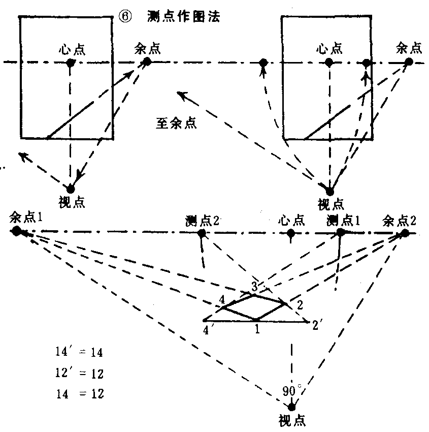 利用测点进行作图的方法。❶先画视点确定左右消灭点和测点。❷在1点画线消灭两余点,在基线确定实际长度(任意所需长度)1—2′,1—3′。各连测点交于消灭线得2、3点,再画余点消灭线相交于4,把1、2、3、4相连便是所求的透视形。此法可画任意角度透视 (图5❷)。