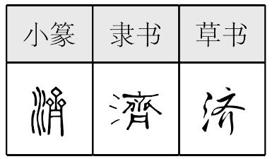 济ji另见ji。济急 济国 济贸 济贫 济世 济事 济助 补济不济 得济 接济 经济 救济 匡济 赈(zhen)济 周济 济国扶危济世安民 济世之才 无济于事 博施济众 假公济私 劫富济贫 刚柔相济 和衷共济 宽猛相济 假日经济 同舟共济 知识经济 知识经济时代 济(一)jì (二)jǐ【辨形】 右是齐,底下是一撇一竖。9画。形声。 【辨义】济(一)jì ❶救助:济急|济贫|济世|济助|济困扶危|济世安民|接济|救济|赈济|周济|弘济时艰|博施济众|扶贫济困|扶危济困|缓不济急|假公济私|劫富济贫|经纶济世|开国济民|杀富济贫|周急济贫|表里相济|刚柔相济。 ❷ 渡,过河:济河焚舟|半济而击|和衷共济|同舟共济。 ❸ 补益:济事|不济|无济于事|以水济水。 〔经济〕 ❶社会物质生产和再生产的活动:经济基础|循环经济。 ❷ 国民经济的总称,也指国民经济的各部门:经济法|农业经济。 ❸ 对国民经济有价值或影响的:经济作物。 ❹ 个人生活用度。 ❺用较少的人力、物力、时间获得较大的成果。 ❻ 治理国家。 (二)jǐ 济水,古水名,发源于河南省,流经山东入渤海。今河南济源市,山东济南市、济宁市、济阳市,都从济水得名。 〔济楚〕(衣着)整齐,漂亮。 〔济济〕形容很多:济济跄跄|济济一堂|人才济济。 【辨析】二音主要区别是: 一、词性有所不同: 济(一)jì除用于“经济”作名词兼形容词外,多作动词,并作动词性语素构成成语;(二)jǐ构成名词、形容词,并作形容词性语素构成成语。 二、适用范畴不同: 济(一)jì除表示“经济”义外,主要表示动作行为;(二)jǐ用于水名、市名,并表示服饰和人数等状况。 济(同)渡 津 济jì❶救助:这东西虽然值钱,究竟不过是药,原该~众散人才是。(七七·1896)势败休云贵,家亡莫论亲。偶因~刘氏,巧得遇恩人。(五·109) ❷中用;成:谁想他命运两~,不承望自到雨村身边,只一年便生了一子;又半载,雨村嫡妻忽染疾下世,雨村便将他扶作正室夫人了。(二·30) 古代名物 > 地物類 > 水部 > 涯渚 > 津3 > 濟 濟 jì 亦稱“津濟”。渡口。《詩·邶風·匏有苦葉》:“匏有苦葉,濟有深涉。”朱熹注:“濟,渡處也。”北魏·酈道元《水經注·河水三》:“河水于二縣之间,濟有君子之名……濟在雲中城西南二百餘里。”南朝宋·顏延之《北使洛》詩:“伊穀絶津濟,臺館無尺船。” 济jì旧时北京的瑞蚨祥号绸布洋货店货价暗码,谓数目五,参“汉、泗、淮、汝、济、恒、衡、岱、华、嵩”条。 济jì〖名词〗 一、水名。古与江淮河并称四渎。源出河南济源县王屋山(2)。《乐毅报燕王书》:以天之道,先王之灵,河北之地,随先王举而有之于济上。——依靠上天的保祐和先王的威灵,黄河以北的地方,被先王全部攻下直到济水边上。《乐毅报燕王书》:济上之军,奉令击齐,大胜之。——济水边上的军队,奉命攻打齐国,取得很大胜利。 二、地名。宋时州名,治所在今山东巨野南(1)。《释秘演诗集序》:十年之间,秘演北渡河,东之济、郓,无所合,困而归。——在十年之中,秘演向北渡过黄河,向东到达了济州,郓州一带,没有得到什么遇合,穷困而归。