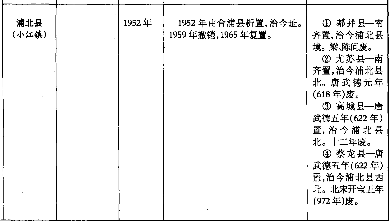 浦北县(小江镇)1952年1952年由合浦县析置,治今址。1959年撤销,1965年复置。❶ 都并县—南齐置,治今浦北县境。梁、陈间废。❷ 尤苏县—南齐置,治今浦北县北。唐武德元年(618年)废。❸ 高城县—唐武德五年(622年)置,治今浦北县北。十二年废。❹ 蔡龙县—唐武德五年(622年)置,治今浦北县西北。北宋开宝五年(972年)废。