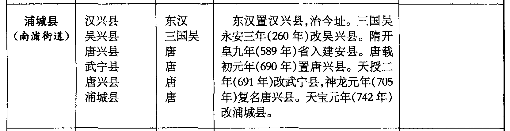 浦城县(南浦街道)汉兴县吴兴县唐兴县武宁县唐兴县浦城县东汉三国吴唐唐唐唐东汉置汉兴县,治今址。三国吴永安三年(260年)改吴兴县。隋开皇九年(589年)省入建安县。唐载初元年(690年)置唐兴县。天授二年(691年)改武宁县,神龙元年(705年)复名唐兴县。天宝元年(742年)改浦城县。