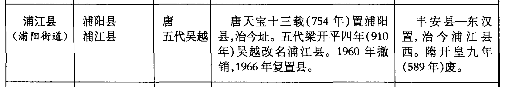 浦江县(浦阳街道)浦阳县浦江县唐五代吴越唐天宝十三载(754年)置浦阳县,治今址。五代梁开平四年(910年)吴越改名浦江县。1960年撤销,1966年复置县。丰安县—东汉置,治今浦江县西。隋开皇九年(589年)废。
