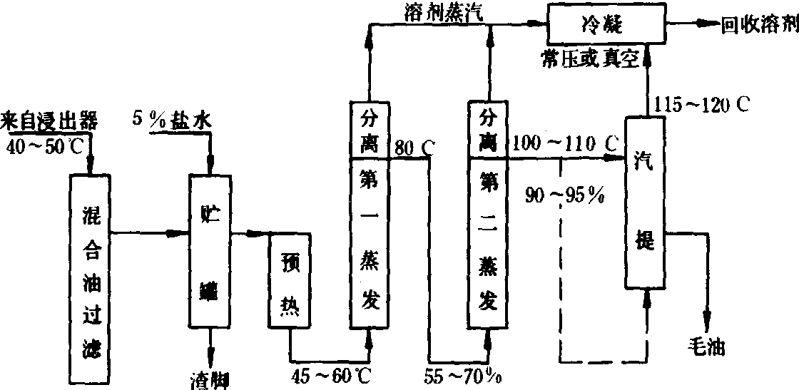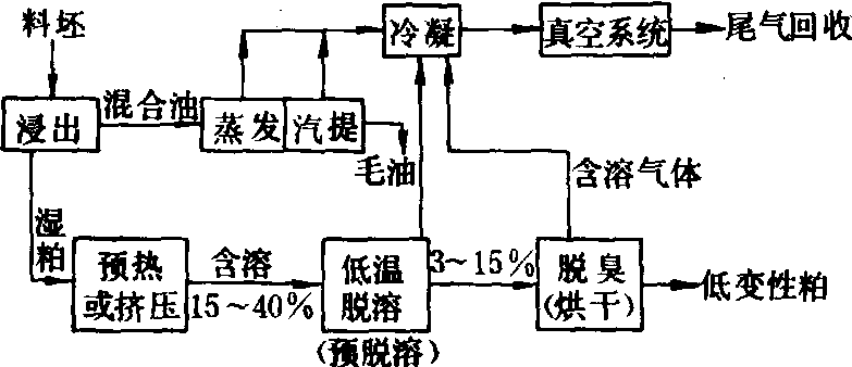 混合油蒸发系统 从浸出后的浓混合油中提取毛油,并回收溶剂的系统。该系统包括混合油蒸发(预浓缩)与汽提脱溶两部分,其工艺流程见图2。❶混合油蒸发。是利用溶剂易挥发的特点,将混合油进行间接加热使溶剂气化的过程。要求经一次(或两次)蒸发使浓度达到90%~98%。蒸发设备大多采用升膜式长管蒸发器,直立长管内的混合油呈薄膜状态,由下而上移动,在间接蒸汽加热的条件下,使溶剂迅速蒸发形成推动力以达到浓缩的目的。 ❷汽提脱溶。是借助蒸馏原理,将经过蒸发的浓混合油中的少量溶剂,用直接蒸汽脱除,取得毛油(允许残留溶剂为50~1000毫克/升)的过程。常用的汽提设备有两种。一是管式汽提塔,结构与长管蒸发器相似,塔釜设有直接蒸汽喷嘴与列管相匹配,进行顺流式(由下而上)汽提脱溶,其结构简单,适用于中小规模的油厂。二是层碟式汽提塔,由12至20组锥形碟盘配置而成,混合油自上而下,而直接蒸汽(一次或两次)由下而上进行逆流式接触脱溶,其效果好,但结构较复杂。汽提脱溶须确保足够的直接蒸汽量。此外,尚有混合油蒸发与汽提组合型装置。 图2 混合油蒸发工艺 湿粕脱溶系统 借助蒸馏原理脱除浸出湿粕中残留溶剂,并进行回收的系统。提高脱溶效果的技术措施有:❶降低湿粕含溶量,降低粕中水分减少直接蒸汽用量,宜采用预脱溶技术如机械法(沥干、挤压)、热力法(预热蒸发、闪蒸脱溶)或挤压热力结合法等; ❷足够的直接蒸汽量; ❸必需的料层高度与脱溶时间; ❹减少排溶阻力形式微负压操作。常用的脱溶设备有多段卧式烘干机、高料层蒸烘机、层叠式蒸烘机和蒸烘冷却组合装置等。 溶剂回收系统 从蒸发脱溶排出的溶剂蒸汽、混合蒸汽、尾气及废水中回收溶剂,以供继续循环使用的系统。包括冷凝、冷却、分水、废水蒸煮、吸收、冷冻及吸附等工序。分水是根据比重的不同将蒸脱机、汽提塔等混合蒸汽冷凝液中的溶剂与水,进行连续分离。排出的废水须进一步蒸煮(水温控制在92~95℃),将残留溶剂蒸发回收。尾气回收是将浸出系统排出的未凝结气体中所含溶剂进行回收。尾气回收工艺有冷却冷冻法、液蜡或植物油吸收法和固体吸附剂回收法三种: ❶冷却冷冻法,将尾气冷却到低温(0~-15℃),以降低含溶量的方法。若冷却到-15℃,每立方米尾气中含溶剂仅96.3克,回收率可达85%~90%。该工艺简单可靠,适用于中小型油厂。 ❷液蜡或植物油吸收法,利用液蜡或植物油作吸收剂与溶剂互溶的原理,回收尾气中溶剂的方法。其回收率达90%以上,但配套设备及操作要求较高,并可能产生液蜡污染,适用于大中型油厂。 ❸固体吸附剂回收法,利用活性碳等能吸附溶剂的特性,回收尾气溶剂的方法。这种回收法包括吸附、直接蒸汽蒸脱、冷凝回收、吸附剂干燥、冷却复活等过程。回收率高达99.9%,但为间歇式生产、活性碳的复活频繁,易发生粉尘爆炸。 浸出工艺 主要有常规常压浸出、余热利用浸出及低温浸出三种: ❶常规常压浸出工艺,整个系统在常压或微负压条件下操作,在不考虑余热利用时,每吨料坯能耗指标为耗电20千瓦小时、耗煤74千克或耗蒸汽520千克、耗水20吨,耗溶剂5千克以下。溶剂均在常压与较高温度条件下进行回收,毛油与粕受高温影响较大。 ❷余热利用浸出工艺,利用蒸发、蒸脱系统等二次蒸汽的热量,完成浸出制油的工艺。该工艺节省能耗、低温脱溶、毛油和粕的品质好,但总热交换面积增加、设备投资较高。 ❸低温浸出工艺,确保料坯或毛油在低温(<80~82℃)条件下进行浸出制油的工艺。目的在于取得低变性浸出粕及高品质毛油。有低温蒸发汽提、湿粕低温脱溶以及两者结合等工艺路线(图3),其中湿粕低温脱溶的方法有过热溶剂闪急循环加热脱溶、气力输送闪蒸脱溶法、干热真空低温脱溶法等。通常包括脱溶与脱臭两部分。基本要求是脱溶后粕的含溶量低于8%,过热溶剂气体温度120~160℃,在真空条件下脱臭(即除去残留溶剂)需喷少量直接蒸汽(约占饼粕重量1%~2.5%),脱臭温度70~88℃,蛋白质变性率低于5%,PDI值(蛋白质分散指数值)大于70%。该工艺的特点是批量生产的低变性浸出粕可供进一步制取植物蛋白原料之用,利用过热溶剂加热脱溶,可降低每吨料坯的耗汽量和冷凝用水量,高温溶剂气体易泄漏、与空气接触易燃易爆,增加了溶剂消耗与操作的安全要求。 图3 低温蒸发汽提与湿粕脱溶的工艺 |