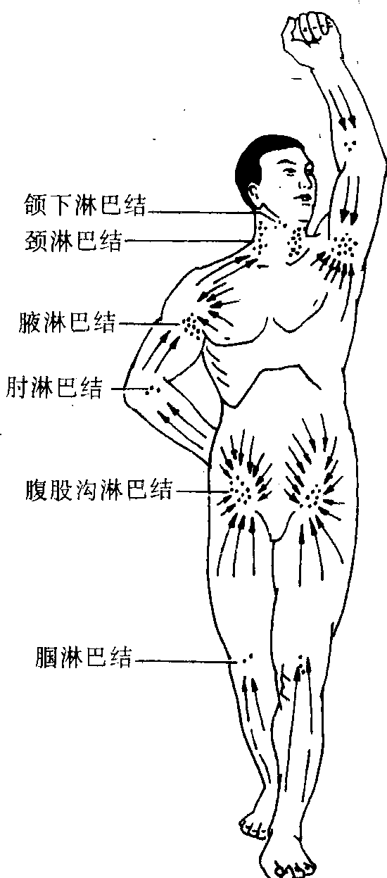 释义 | 淋巴循环和淋巴结 淋巴循环和淋巴结淋巴液在淋巴管中运行称为淋巴循环。由于淋巴液起源于组织液,最后流入大静脉,因而认为是循环系统的一部分,是静脉的辅助机构,帮助把体液输送回心脏。此外,由于有许多淋巴结,还有制造淋巴细胞、吞食侵入体内的微生物、产生抗体等重要功能。毛细淋巴管一端为盲端,起于组织细胞间隙。一小部分组织液(包括其中的少量蛋白质)经毛细淋巴管吸收成为淋巴液,经小淋巴管、中等大小淋巴管、较大的淋巴管,最后由两支总淋巴管进入大静脉回流至心脏。淋巴管内有瓣膜可防止倒流。淋巴液在流动途中经过一系列淋巴结时均可获得淋巴细胞,由于无红细胞故为无色透明液体。但因肠道中的毛细淋巴管因可吸收脂肪滴,致使饭后大淋巴管中的淋巴液常常是白色乳糜液。淋巴结是在淋巴管行程上的无数大小不一的圆形小体,常群集在一定的部位(见图1.5-7)。淋巴结在和病菌做斗争时,本身往往肿大、疼痛甚至化脓、破溃。体内淋巴结群分别接受身体一定区域或一定器官的淋巴回流。当某处淋巴结肿大时,常提示所属区域或器官有炎症或癌肿。因而,了解淋巴结群的位置、所接受的范围、及发出的淋巴管的去向有重要的临床意义。人体具有诊断意义的淋巴结有:颌下淋巴结(位于下颌骨下方,肿大时表示口腔、鼻腔或面部有病变)、腋淋巴结(位于腋窝深处,肿大时表示上肢或乳房有病变)、腹股沟淋巴结(位于腹股沟部,肿大时表示下肢或外阴部有病变)和锁骨上淋巴结(在锁骨上凹内,肿大时表示内脏癌肿转移)。 图1.5-7 人体主要淋巴结位置 ☚ 组织液与水肿 安静时维持血压相对稳定的反射 ☛ |