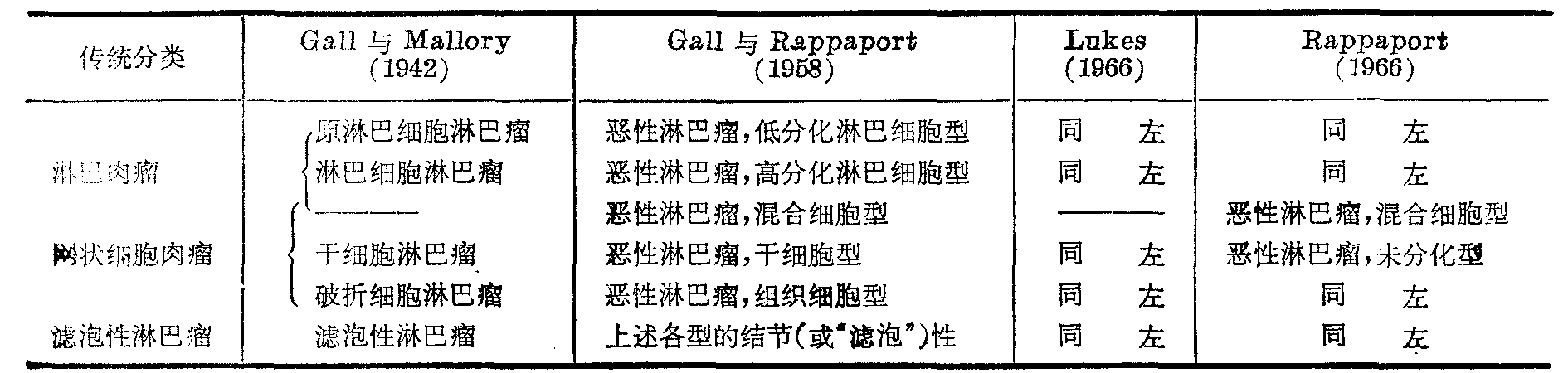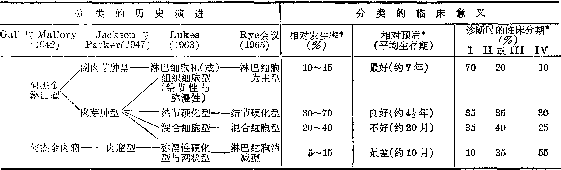 *按中国调整率:男1.35,女0.96,总1.16 据国内12个单位收治的4,023例恶性淋巴瘤患者中,何杰金病1,173例,占29.1%; 非何杰金淋巴瘤2,850例,占70.9%(肿瘤防治研究,1976)。 分类 淋巴瘤的现代分类开始于1940年以后,当时划分为何杰金病与非何杰金淋巴瘤两类,至今仍获得一致的公认。Gall与Mallory (1942)将何杰金病分为淋巴瘤与肉瘤两类,预后完全不同,但过于简单。Jackson与Parker (1947)进一步将何杰金淋巴瘤分为副肉芽肿与肉芽肿两型,但由于所有何杰金病的病例中,近90%属于肉芽肿型,此种分类法的实际价值不大。主要根据Lukes等的研究,对肉芽肿型作了进一步的划分,在Rye会议(1965)得到了通过。根据此种分类法,各类的发生率、预后与诊断时的临床分期有明显的不同,而且在发病与扩散方式上也有一定差别,因此,当前在国际上被广泛采用。何杰金病分类的演进与其临床意义见表2。 1940年以前,除蕈样肉芽肿于1835年由Alber描述以外,非何杰金淋巴瘤(即何杰金病以外的各种恶性淋巴瘤)主要包括淋巴肉瘤、网状细胞肉瘤与滤泡性淋巴瘤三类。1940~1970年非何杰金淋巴瘤分类的演进见表3。1966年Rappaport分类是在Gall和Mallory(1942)与Gall和Rappaport (1958)分类的基础上提出来的。本分类系根据活体淋巴组织有无滤泡形成,分为结节性与弥漫性两类,每一类又根据细胞的主要类型与其分化程度进一步加以划分。本分类法见表4。 一般说来,上述分类法与患者的预后关系密切。淋巴细胞型较组织细胞型的预后好,高分化细胞型较低分化细胞型预后好,结节性较弥漫性预后好。在发生率方面,根据统计数字,结节性低分化淋巴细胞型与弥漫性组织细胞型最高,均在19~30%之间; 其次为弥漫性低分化淋巴细胞型 (14~20%) 与结节性混合细胞型 (10~
