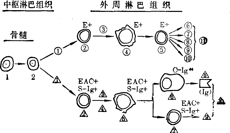 由于此种分类法具有相当多的优点,只依靠传统的病理组织学方法,简便易行;特点明确,具有可重复性;与预后关系密切,对临床治疗有一定的指导意义。因此,直到今日,本分类法在国际上,尤其是在美国,仍广泛应用。 自1966年以来,人们对淋巴细胞的认识有了重大进展。现已确知淋巴细胞是高等动物的免疫活性细胞,主要分为两个亚群,其一为胸腺依赖性淋巴细胞,通常称T淋巴细胞,执行机体细胞免疫的任务。另一类为B淋巴细胞,执行体液免疫的任务。在鸟类,淋巴样干细胞在胚胎期通过腔上囊的作用,发育成为B淋巴细胞。在哺乳动物,肠道淋巴组织或骨髓可能具有鸟类腔上囊的作用。骨髓淋巴细胞来自淋巴样干细胞,经过胸腺与类腔上囊组织的作用,分别发育成为未致敏的T细胞与B细胞(见图)。在接受抗原刺激以后,经过转化,前者发育为致敏的T细胞,后者发育为浆细胞与致敏的B细胞。如相同抗原第二次在体内出现,致敏的淋巴细胞将于较短时间内作出更强烈的反应。 T细胞的转化过程比较简单,经过T原免疫细胞后,即成为致敏的T淋巴细胞。各阶段T细胞的表面均有羊红细胞受体,可自发地和羊红细胞形成玫瑰花结(E+)。B细胞的转化过程比较复杂,当第一次接受抗原刺激时,致敏的B淋巴细胞即由淋巴结的皮质区进入淋巴滤泡,经过小裂细胞、大裂细胞、小无裂细胞、大无裂细胞等阶段,然后离开滤泡进入滤泡间区,转化为B原免疫细胞。裂细胞是根据细胞核出现裂痕而命名的,基本上是不分裂的,而无裂细胞则是滤泡中的分裂细胞。裂细胞与无裂细胞又统称为滤泡中心细胞。因此,具有滤泡结构的结节性或滤泡性淋巴瘤基本上由B细胞组成。在滤泡间区的原免疫细胞直接或通过浆细胞样淋巴细胞,发育成为能合成并分泌免疫球蛋白的浆细胞。 各阶段的B细胞表面没有羊红细胞受体,但有补体第3成分(C3)的受体,用羊红细胞、抗羊红细胞抗体和补体的复合物与B细胞表面的C3受体结合,也可形成玫瑰花结(EAC+)。此外,B细胞表面还携带免疫球蛋白(S-Ig+),浆细胞浆内合成并分泌免疫球蛋白(C-Ig+),均可用特殊方法显示出来。 淋巴细胞在转化过程中,由原来胞浆少,核固缩的小淋巴细胞转化为体积大(可达原来的4倍)、胞浆(嗜派若宁)多、胞核大、染色质呈细网状、出现核仁并有分裂能力的大细胞。上述大裂细胞、小无裂细胞、大无裂细胞以及T与B原免疫细胞均属于大细胞的范畴。过去误认这些