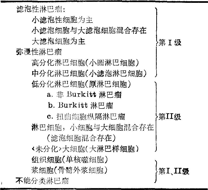 因此,目前在国际上应用较广的Rappaport(1966)分类在理论上已经陈旧,不符合当前人们对淋巴细胞的认识,必须加以改进。此外,在原来的分类中,未将特殊类型淋巴瘤,如蕈样肉芽肿、浆细胞瘤、伯基特(Burkitt)淋巴瘤等包括在内。不过,如何改进尚有许多不同的意见,表5至表9是当前几种值得重视的建议。至今尚未出现