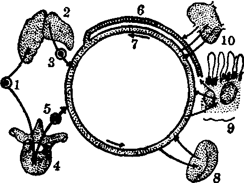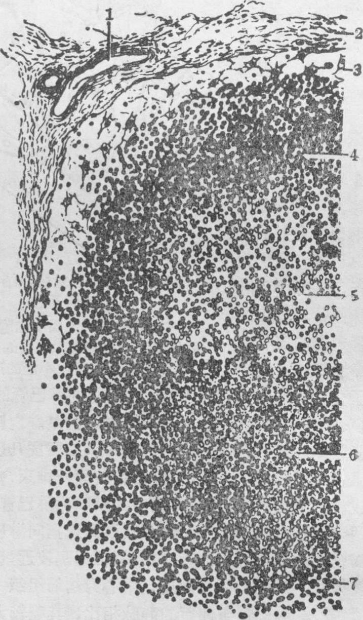 释义 | 淋巴组织lymphatic tissue动物体内含有大量淋巴细胞的组织。由网状组织支架中充以大量淋巴细胞构成。可以分为中枢淋巴组织和周围淋巴组织两类。中枢淋巴组织分布于胸腺及鸟类腔上囊,其支架为上皮性网状细胞,不含网状纤维;上皮性网状细胞构成淋巴细胞分裂分化的微环境,诱导干细胞分化成为成熟淋巴细胞;其中,胸腺哺育T淋巴细胞成熟,腔上囊哺育B淋巴细胞成熟。周围淋巴组织分布于淋巴结、脾脏、扁桃体等器官,其支架为普通网状细胞和网状纤维,有弥散淋巴组织和淋巴小结两种。弥散淋巴组织中淋巴细胞分布均匀,以T淋巴细胞为主;淋巴小结呈球形或椭球形,以B淋巴细胞为主。大量淋巴组织构成淋巴器官,亦有部分淋巴组织存在于肠等非淋巴器官中。 淋巴组织lymph tissue系由网状结缔组织和无粒白细胞共同形成的一种特殊组织。淋巴组织中的网状纤维形成网状支架,在网眼内充满了大量淋巴细胞和数目较少的网状细胞、单核细胞和浆细胞等。淋巴组织在人体内分布很广泛,约占体重的1/10,其中淋巴结、脾、胸腺、扁桃体含此成分最多。 淋巴组织含有大量淋巴细胞的组织。其支架常由网状组织构成。常以弥散淋巴组织和淋巴小结的形式,存在于消化道和呼吸道粘膜中。由大量淋巴组织构成的器官称为淋巴器官,多位于淋巴通路和血液通路上,具被膜及一定的形态结构,如胸腺、脾、淋巴结及扁桃体等。是参与机体免疫反应的重要结构。 淋巴组织lymphoid tissue是由网状组织和淋巴细胞构成的一种组织。其主要构成淋巴器官,如淋巴结、脾、胸腺等。也有的弥散存在,称弥散淋巴组织,如消化管壁上的弥散淋巴组织。大多数淋巴组织均由网状细胞和网状纤维构成立体网架,网眼中填充着大量淋巴细胞和少量巨噬细胞;也有的淋巴组织,如胸腺中的淋巴组织,只有网状细胞构成立体网架,无网状纤维参与。 淋巴组织 淋巴组织淋巴组织是含大量淋巴细胞的网状组织,主要由两类细胞组成。一类是中胚层来源的网状细胞,呈星形,有多个突起,同网状纤维一起相互连成多孔的网架,除有支持作用外,并构成淋巴细胞和其它细胞生存和相互作用的微环境(参见“网状细胞”条)。另一类是迁入的细胞,包括淋巴细胞、浆细胞、巨噬细胞、淋巴树突细胞、小结树突细胞、交错突细胞、肥大细胞和粒细胞等,充满在网状细胞的网孔中。淋巴细胞最多,在此进行分裂和分化。淋巴组织的细胞类型和数量,因所在部位和免疫功能状态而有明显的差异。淋巴组织是构成胸腺、脾、淋巴结和扁桃体的主要组织,并分布于某些器官的粘膜中,其中以消化管和呼吸管道更丰富。淋巴组织分弥散淋巴组织和淋巴小结两型。胸腺和鸟类腔上囊的淋巴组织的结构较特殊,由内胚层来源的上皮性网状细胞构成网架,没有网状纤维。上皮性网状细胞可分泌激素,并为淋巴细胞的早期分化提供适宜的微环境,使淋巴干细胞分化为有免疫活性的淋巴细胞。有人称这种组织为中枢淋巴组织(参见“胸腺”条和“腔上囊”条)。 图1 淋巴小结结构模式图 1.输入淋巴管 2.被膜 3.被膜下淋巴窦 4.帽 5.明区 6.暗区 7.副皮质区 辅助细胞 它们是引起免疫应答必需的起辅助作用的细胞,有巨噬细胞小结树突细胞、淋巴树突细胞和交错突细胞等,都是迁来的细胞,其数量随功能状态有很大的变化。除巨噬细胞有强盛的巨噬能力外,其余的几种细胞无巨噬作用,粘附力小。这些细胞发出多个树状或薄纱状突起,伸到淋巴细胞之间。核呈不规则形,染色质少。胞质除有较多线粒体和微丝外,其余的细胞器均不发达。小结树突细胞分布于淋巴小结内; 交错突细胞分布于胸腺依赖区,淋巴树突细胞则分布于一般的淋巴组织内,与形成和调节局部的微环境有关,使淋巴细胞在淋巴组织内形成有规律的配布。 淋巴细胞再循环 淋巴器官和淋巴组织位于身体各部。它们所含的淋巴细胞不断经血流和淋巴周流全身,并常迁移到别的淋巴器官和淋巴组织中。血流中的淋巴细胞常穿越具有高内皮的毛细血管后微静脉进入淋巴组织,驻留长时间后又再循环或迁移。淋巴细胞的这种反复循环和迁移称淋巴细胞再循环(图2)。参与再循环的淋巴细胞总体称淋巴细胞再循环库,其数量约为血流淋巴细胞的数十倍。淋巴细胞是个混合群,循环最频繁的是T记忆细胞和B记忆细胞。T细胞经淋巴结再循环一次约18~24小时,B细胞约30小时。经脾的再循环较快,只需2~4小时。有些细胞如K细胞、NK细胞、浆细胞的前身细胞和效应性T细胞等经血流进入病灶,不再循环。 图2 淋巴细胞再循环示意图 1.造血干细胞 2.胸腺 3.T细胞 4.骨髓 5.B细胞 6.淋巴管 7.血循环 8.脾 9.粘膜淋巴组织 10.淋巴结 淋巴细胞进出淋巴器官和淋巴组织的主要通道是毛细血管后微静脉。淋巴组织内的毛细血管后微静脉的内皮细胞呈立方形,细胞表面有专供淋巴细胞识别的抗原。不同部位的血管内皮细胞表面抗原略有差别,各种淋巴细胞表面的抗原受体各异,因而各淋巴器官和淋巴组织内的淋巴细胞组分不同。带有IgG膜抗体的B细胞可进入淋巴结,带有IgA膜抗体的B细胞可进入消化道和呼吸管道粘膜的淋巴组织。T细胞和某些B细胞能识别两种抗原,故它们可随处停留。淋巴细胞只有在它的抗原受体与内皮细胞表面抗原结合时,才可穿过内皮细胞或细胞间隙进入淋巴组织。抗原刺激后淋巴组织的