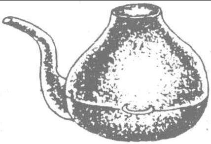 释义 | 古代名物 > 醫藥類(下) > 醫療器具部 > 容器 > 淋洗壺 淋洗壺 línxǐhú 醫用器具名。使用時,將藥液倒入壺中,用軟布蘸藥水反復淋漓患處。1974年江蘇省江陰縣明朝夏顴墓曾出土實物。瓷質,霽藍色。壺嘴細長,腹部兩側各有一穿帶耳,高十一·九厘米,腹徑十三·六厘米。 淋洗壺 (明夏顴墓出土) |