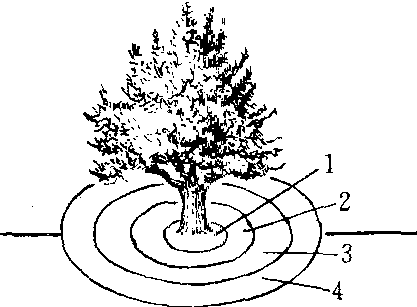释义 | 深翻扩穴deep turn over and expanding又称放树窝子。定植果苗后,逐年扩大定植穴范围,并深翻熟化其外围土壤的措施。一般要求深60~80 cm。宜在根系生长高峰期进行。落叶果树常在秋季进行,在定植穴外围挖半圆形沟或在定植沟外挖环形沟,分年深翻,直至全园深翻熟化完毕为止。 深翻扩穴示意图 1.定植穴 2. 第一年扩穴 3. 第二年扩穴 4.第三年扩穴 |