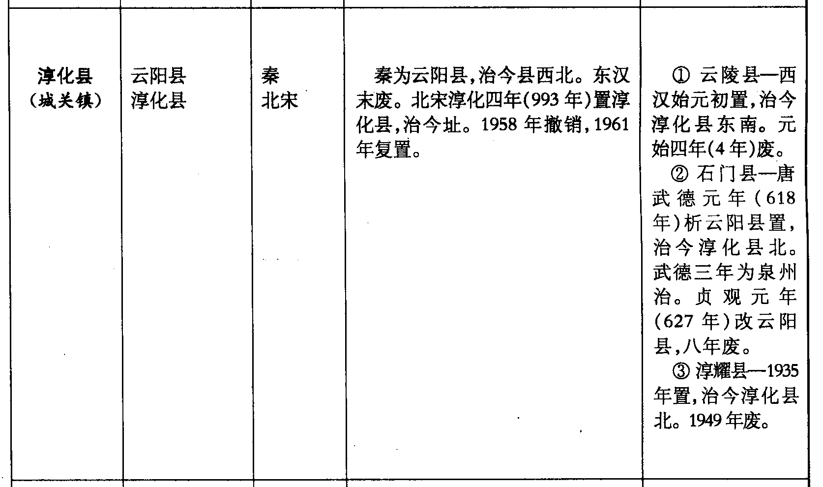 淳化县(城关镇)云阳县淳化县秦北宋秦为云阳县,治今县西北。东汉末废。北宋淳化四年(993年)置淳化县,治今址。1958年撤销,1961年复置。❶ 云陵县—西汉始元初置,治今淳化县东南。元始四年(4年)废。❷石门县—唐武德元年 (618年)析云阳县置,治今淳化县北。武德三年为泉州治。贞观元年(627年)改云阳县,八年废。❸淳耀县—1935年置,治今淳化县北。1949年废。