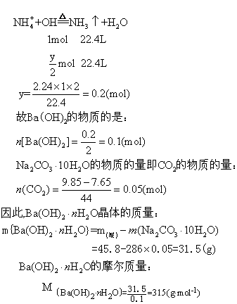 释义 | 混合物反应的计算 混合物反应的计算hunhewu fanying de jisuan解题时注意: 答 原合金的百分组成为A112.5%,Si22.7%,Fe64.8%。 例2 把一块带锈铁片与适量稀硝酸充分反应, 共收集到112mL NO (标准状况),当向溶液中滴入KSCN溶液不再显红色时,还剩5g铁;取出剩余的铁,溶液中的Fe2+跟168mL Cl2(标准状况) 恰好完全反应。求原带锈铁片中铁和铁锈 (视为Fe2O3) 的质量各为多少? 解 设与HNO3反应的铁质量为xg,生成Fe3+的物质的量为x′mol: 设被还原的Fe3+的物质的量为zmol,反应中消耗铁的质量为z′g: 铁片上含铁的质量 x+z′+5=0.28+0.28+5=5.56(g) 铁片上含三氧化二铁的质量 m=M·nB=160×0.0025=0.4(g) 答 原带锈铁片中含铁5.56g,含氧化铁0.4g。 例3 有2价金属M的氢氧化物的水合晶体跟碳酸钠晶体(含10分子结晶水)的混合物45.8g,溶于足量水生成白色沉淀,将沉淀滤出、洗涤、烘干后称其质量为9.85g,高温灼烧质量变为7.65g。将上述滤液分成二等份,取1份滴入酸不产生气体,取另 一份与足量铵盐共热,产生干燥气体2.24L (标准状况)。求M的相对原子质量及M的氢氧化物水合晶体的分子式。 解 依题意,滤液中无CO2-3,全部转化为沉淀,设M的相对原子质量为x。 x=137,M为钡元素。 设 M 的氢氧化物的水合晶体分 子式为Ba(OH)2·nH2O,产生的OH- 的物质的量为ymol,在一等份中OH-的物质的量为y/2mol, 则 137+17×2+n×18=315 n=8,故M的氢氧化物的水合晶体分子式为Ba(OH)2·8H2O 答 M的相对原子质量为137,氢氧化物的水合晶体分子式为Ba(OH)2·8H2O。 ☚ 反应前后量的增加与减少 化学反应速率的计算 ☛ |