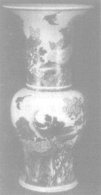 康熙年间御窑厂产品。此器俗称 “凤尾尊”。广口外撇,颈细长,圆肩,肩以下渐敛,近底处外撇,圈足。风格劲挺爽利,饱满有力,潇洒俊逸。尊通体用五彩铁线描绘纹饰,颈、腹共五组,画意基本相同:牡丹盛开,花叶红艳,雉鸡栖息于山石,雀鸟飞翔于天空,春光灿烂,生机盎然。图案使用红、黄、蓝、绿、紫等色彩,颜色纯正明丽。此尊作为主题装饰的牡丹,是吉祥富贵的象征,是我国工艺制品所广为使用的装饰。但康熙时期的瓷绘牡丹,独具特色,多于花头上方左右各出一叉,这就是有名的康熙“双犄牡丹”。此尊在造型、设色、装饰等方面具有明显的时代风格,且技艺高超,是康熙早期瓷器的代表作品。