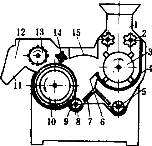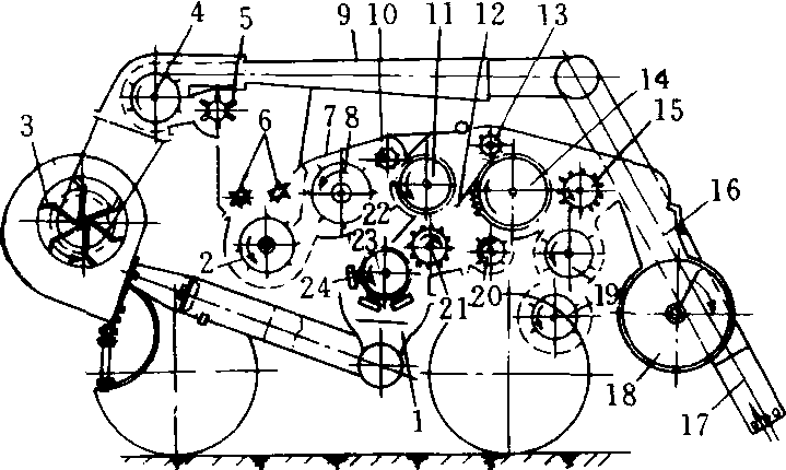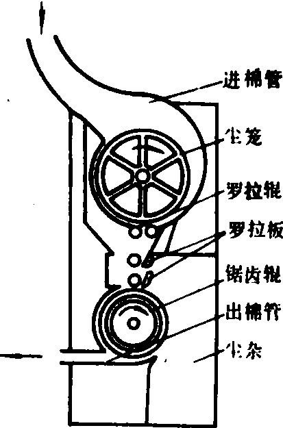 释义 | 清棉机cotton cleaner清理棉花中各种杂质(包括不孕籽、僵瓣、铃壳、果枝、叶片、砂石等)的机械。包括籽棉清理机和皮棉清理机。前者用在轧花之前,后者用在皮棉打包之前。籽棉清理一般应按先清除重杂物,后排僵,再松解清杂的顺序进行。皮棉清理在中国尚未普遍采用,大多在纺纱厂前纺工艺中合并进行。 图1 锯齿辊筒式籽棉清理机 1.盛花斗; 2.喂花辊;3.松花辊筒; 4.排杂网; 5.排杂螺旋;6.端板; 7.钢丝刷条; 8.排杂调节板; 9.小锯齿辊筒;10.大锯齿辊筒; 11.消花板; 12.出花口;13.毛刷辊筒; 14.拨花辊;15. 导向板 锯齿辊筒直径一般为250~600毫米,线速度3~5米/秒,毛刷辊筒的线速度约为锯齿辊筒的1.5~2倍。籽棉清理机的生产率则由幅宽确定。 重杂物沉积器 有离心式和圆筒式两种,主要用于清除重杂,一般设置在籽棉清理机前面的输棉管道中。离心式重杂物沉积器是一个带垂直叉管的90°弯管。过弯管时,重杂物坠落在叉管活门上,当配棉管道中风门关闭,活门自动打开,重杂物落到叉管底板上,积到一定数量时,打开底板取出。 皮棉清理机 常用的有锯齿辊筒式和气流式两种类型,主要用于清理前道工序未清除的和因轧花过程中产生的细小杂质。这些杂质影响棉纱的强力和外观质量。气流式和锯齿式皮棉清理机工作宽度与轧花机相近,处理量相匹配。机摘棉轧花后皮棉含杂率经过两次清理后一般可由4~6%降到2~4%。 气流式皮棉清理机 使皮棉在压力为490~622帕的高速气流下进入机器的输棉管道,管道在拐弯处断面缩小,并开有喷口,使皮棉内较重的杂质在惯性作用下,从喷口喷出,落在杂质收集箱内,由螺旋输送器排出;皮棉则继续沿管道向前。喷口喷出的杂质量可由调节板控制。气流式皮棉清理机无转动部件,不损伤棉纤维,但清杂效率低于锯齿式。 图2 锯齿式皮棉清理机 锯齿式皮棉清理机 亦称可控棉胎式皮棉清理机,结构如图2。皮棉输入尘笼后形成棉胎,尘笼带着皮棉旋转,被一对作相对转动的罗拉辊逐步向下输送,被第二组罗拉辊和罗拉板接住,再进行压实,棉胎减薄;然后经过第三组较高转速的罗拉辊和罗拉板使棉胎趋于均匀和减薄,同时起到梳刷纤维的作用。在锯齿辊筒高速旋转及离心力的作用下,杂质通过尘棒抛出,排落输送机外,皮棉则随锯齿辊筒转到出棉口被气流吸走。 锯齿辊筒直径一般在400毫米左右,线速度为18米/秒,尘棒与锯齿辊筒间隙可以调节,一般顶端0.8毫米,下端为4.8毫米。 清棉机cotton cleaner又称净棉机。清除机器采摘籽棉中所夹杂的泥土、铃壳、棉枝、碎叶等杂物,以提高棉花品质的机械。清棉机由多个尺寸及结构不同的锯齿滚筒和刷棉辊组成。工作时,待清理的籽棉被吸棉管送入清棉机,经锯齿滚筒多次拉绕及刷棉辊的梳刷,各种杂物分别落入杂物收集器中;清理过的籽棉被抛入棉箱,由螺旋推运器压出装袋。该机还能剥开棉铃取出籽棉。 清棉机 1.排杂漏斗 2. 松棉除杂滚筒 3. 风扇 4. 大齿板滚筒 5. 真空阀 6. 喂料辊 7. 剥壳板 8. 剥壳滚筒 9. 扩散器 10. 铺棉小刷筒 11. 中锯齿滚筒 12. 阻隔板 13.拨花筒 14. 大锯齿滚筒 15. 上脱棉滚筒 16.漏斗 17. 吸棉管 18.压棉装袋螺旋 19. 碎叶清除滚筒 20.抛掷筒 21.下刷筒 22. 王分滚筒挡筛 23. 小锯齿滚筒 24. 刷子 清棉机scutcher |