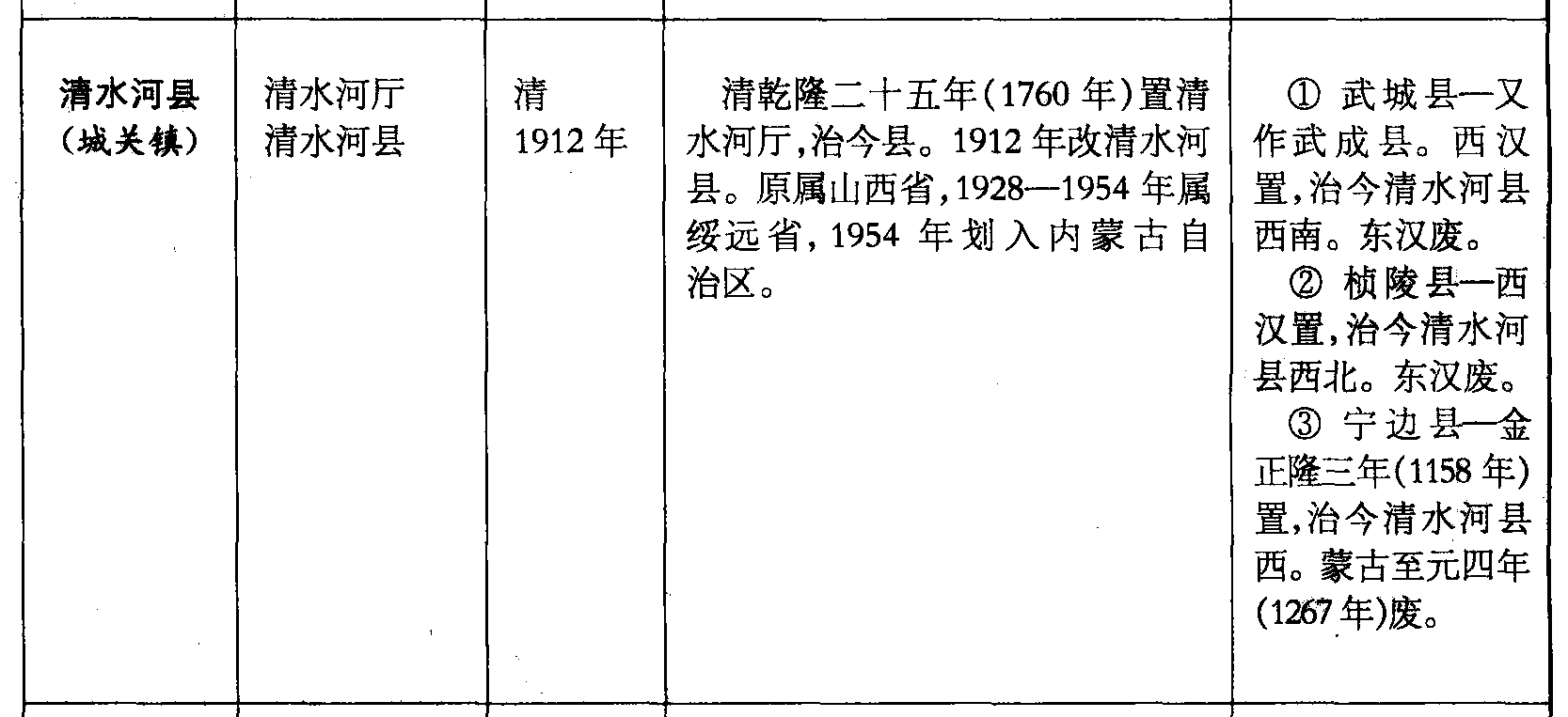 清水河县(城关镇)清水河厅清水河县清1912年清乾隆二十五年(1760年)置清水河厅,治今县。1912年改清水河县。原属山西省,1928—1954年属绥远省,1954年划入内蒙古自治区。❶ 武城县—又作武成县。西汉置,治今清水河县西南。东汉废。❷ 桢陵县—西汉置,治今清水河县西北。东汉废。❸ 宁边县—金正隆三年(1158年)置,治今清水河县西。蒙古至元四年(1267年)废。