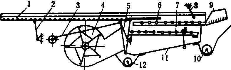 释义 | 清选装置cleaning unit从分离装置已分离出长茎秆的脱出物中清除杂质而获得较纯净谷粒的装置,也称清粮装置或清粮室。它是谷物联合收割机和脱粒机的重要工作部件之一。 风筛配合式清选装置 1.抖动板; 2.支杆; 3.曲柄连杆机构; 4.风机;5.双臂摇杆; 6.上筛; 7.下筛; 8.吊杆; 9.尾筛; 10.杂余螺旋推运器; 11.滑板; 12.谷粒螺旋推运器 在复式脱粒机中,经上述清选装置筛出的谷粒,由螺旋推运器、升运器送至除芒器,经过除芒后落到第二清选装置再次清选。该装置采用风选式清选。出来的谷粒分成清净完整的一等谷粒和比较混杂、破碎或干瘪的二等谷粒。 风选式清选装置 利用物料相对气流临界速度不同的原理清除混在谷粒中的杂质,主要清除颖壳、碎草等轻杂质。由风机和气流通过的风道组成。按其工作特点可分为吹出型、吸出型和混合型三种。吹出型的风道位于风机出风口,工作时,谷粒混杂物在出风口前落下,轻杂质沿气流通道被吹走,谷粒则由重力作用穿过气流场落下,进入集谷装置。吸出型的风道配置在风机进风口之前,工作时,吸引气流将下落过程中的轻杂质吸入风机叶轮后送出机外,谷粒则落入集谷装置。混合型为两者的结合,备有上、下两个风机,风道中既有出风口的吹出气流,又有吸风口的吸引气流,轻杂质经吸引风机送出机外。 主要清选部件 有清选筛和风机。 清选筛 由筛架、筛子和支杆等组成。筛架有单筛架(上下筛装在一个筛架上)和双筛架(上下筛分别装在两个筛架上相对摆动)两种。它们由支杆(或吊杆)支承,曲柄连杆机构驱动作往复抖动。筛子的类型与构造见筛。清选筛的上筛为颖糠筛,下筛为谷粒筛。上筛主要把碎秸秆、颖糠、断穗等分离出来;下筛将碎杂余物排出,筛选出干净谷粒。上筛后端连接可调节倾角(8°~30°范围内调节)的尾筛,用以筛漏断穗。筛子倾斜安装在筛架上,后高前低,双层筛的倾角为2°左右,单层筛为4°~7°。筛子摆幅为35~60毫米,频率一般为250~300次/分,小摆幅所对应的频率应稍大些。上、下筛的振动幅值比为2:1。 风机 在谷物清选装置上采用的风机有双面进风的农用型离心风机、单面进风的通用型离心风机和径向进气的离心风机。在风筛配合式清选装置和吹出型风选式清选装置中都采用农用型风机。风机的宽度较大,采用双面进风,叶轮为4~6片直叶片、圆筒形外壳或扩展度蜗形外壳。为了使风机全部宽度内风速均匀,通常将叶片两端内部削去一角,以减弱两端气流速度,叶轮直径350~500毫米,转速400~1 000转/分。在风机的出风口处安装有导风板以调节气流的分布。有的谷物联合收割机,为保证沿筛面宽度获得均匀的风速,常采用径向进气风机,在同样气流条件下可缩小径向尺寸约2/5。吸出型风选式清选装置则采用通用型风机,单面进风,叶轮宽度较窄,叶轮直径为250~400毫米,转速1 600~1 900转/分,4~8个叶片,采用蜗形外壳。 发展趋势 随着谷物联合收割机向宽幅、大功率和高效方向的发展,清选装置的负荷也相应增大。除在一定程度上增加筛子面积、采用径向进气风机提高气流速度均匀性、改进清选装置各工作部件的自控监测系统外,还可采用三层筛阶梯布局,由上至下各筛逐次往后错移1/2左右,以缩短筛子上下间距,减少下筛对上筛的气流阻挡,从而降低清选损失;或采用一对加速旋转辊和双风道(风机产生的气流经由上下风道吹出)相配合的结构,使谷粒混杂物经高速旋转辊后以高速呈薄层落入清选室前端,在此过程中,轻杂物则被上风道的气流吹走,这样可大大减少由下风道与之配合的清选筛的负荷,提高清选能力。 |