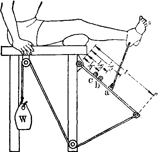 国内报道应用一种等张收缩和等长收缩相结合的渐进抗阻练习法于股四头肌肌力练习,取得较好效果。其方法如下: 先用拉力计测定伸膝肌力,用测得肌力的80~90%作为起始负荷量。每次练习作三个动作: 先用1/2负荷量作抗阻伸膝并维持10秒钟,休息20秒钟。接着用3/4负荷量作抗阻伸膝并维持10秒钟,再休息20秒钟。最后用全负荷量作抗阻伸膝并维持至疲劳。凡最后一次伸膝后维持的时间超过15秒钟时就适当增加负荷量。使用附图所示的简单设备则操作更为方便,图中W为所需负荷重量的1/4,三次练习只要把踝牵引带的铁钩依次钩住杠杆上的a、b、c环,即可得到所需的1/2,3/4及全量负荷。