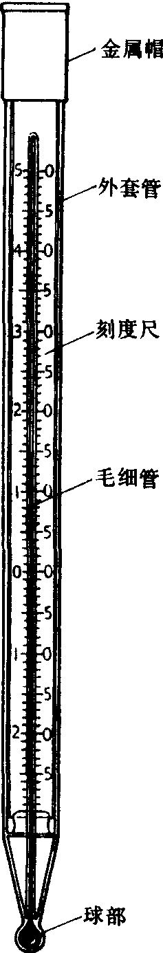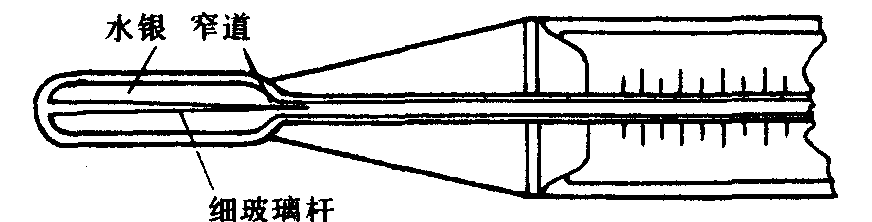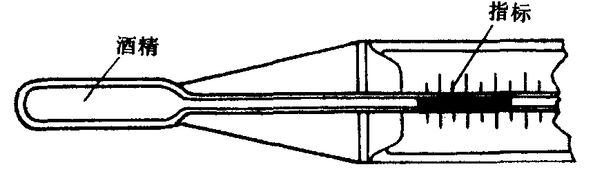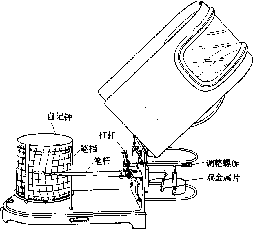 图3 最低温度表 球部及玻璃指标 双金属片温度计 如图6,它能连续记录温度。其感应部分一般是由两种膨胀系数不同的金属片焊接而成的双金属片。 其曲率随温度而变化; 它的一端固定,另一端的位移通过杠杆的放大传递,使记录笔在钟筒的自记纸上记录下温度的连续变化。钟筒旋转一周为一日(日转型)或一星期(周转型)。温度计由于机械摩擦等原因而造成的误差一般可达0.5℃或以上,使用时应对照温度表读数进行记录订正(见温度、温度测定仪器)。