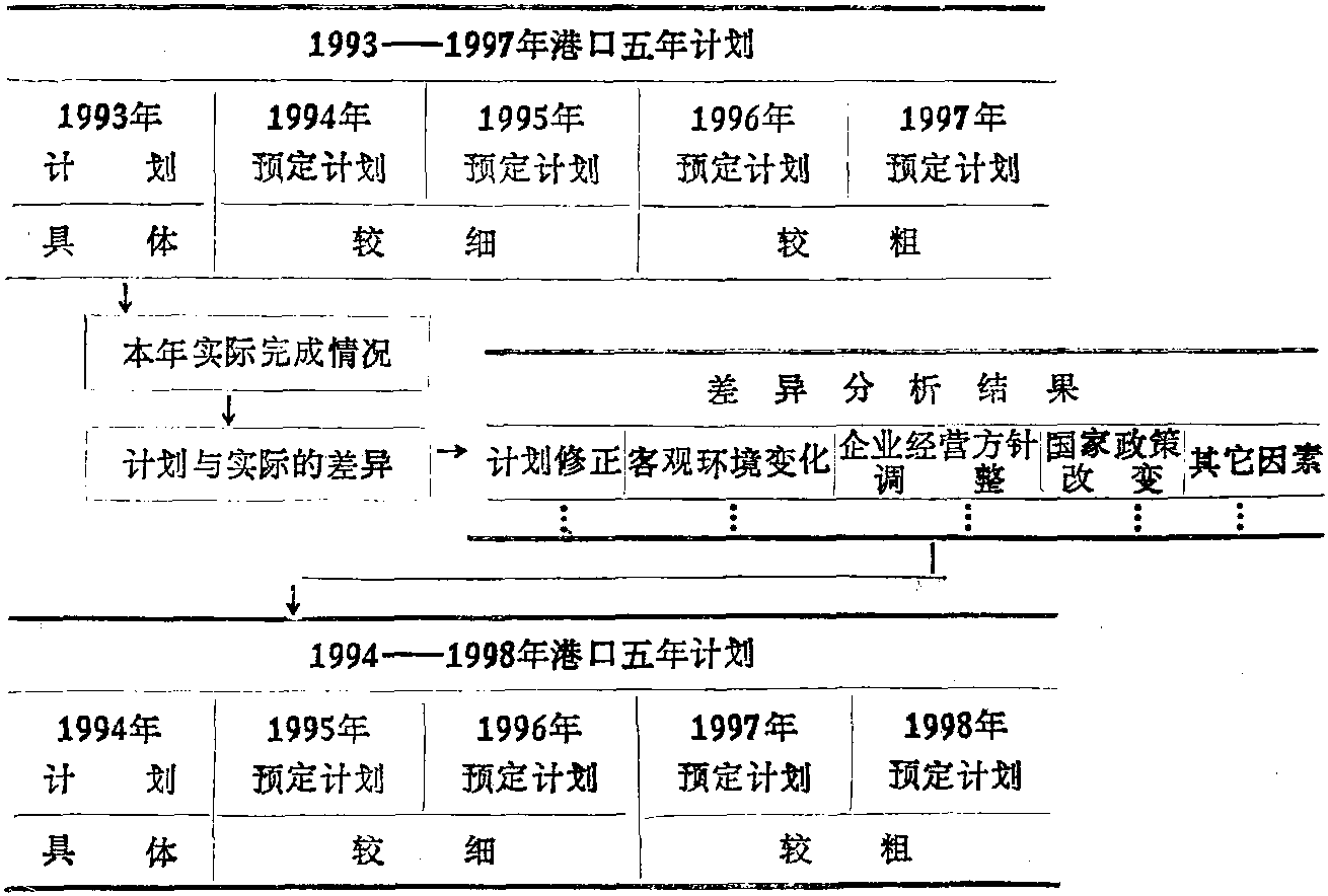亦称“港口滑动式计划”或“港口连续计划”。是用来编制和调整中长计划的一种有效方法,即把港口长期计划与五年计划或港口五年计划与年度计划衔接起来连续编制的一种计划方式。港口的中长期计划由于计划期较长,在编制计划中,不确定因素比较多,要求中长期计划有较大的弹性,因而多采用滚动计划法。所谓滚动计划,是采用近细远粗、不断延伸、边执行边调整的办法,在每个具体计划期终了时,根据计划执行的结果和出现的新情况、新问题,对原定整体中长计划进行调整和修订,并续编一期具体计划,将计划期按顺序向前推进一期,使计划不断滚动,不断延续,形成一个连续过程。其过程如下表所示: