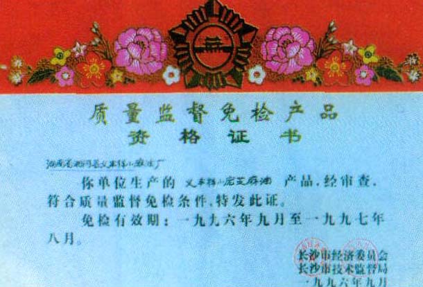 义丰祥小磨芝麻油获长沙市质量监督免检产品资格证书