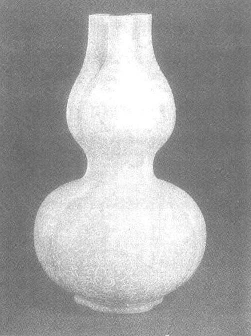 清嘉庆。高20厘米,口径最大7厘米。北京故宫博物院藏。器身呈三葫芦形。这种器形始于雍正时期。三个同样的葫芦连通一体,分别有三个口流,圈足为三连弧式,造型优美。腹部贴塑白色缠枝莲纹并施淡蓝色釉,花纹装饰精细,釉色蓝如湖水,是嘉靖时期官窑的优秀作品。