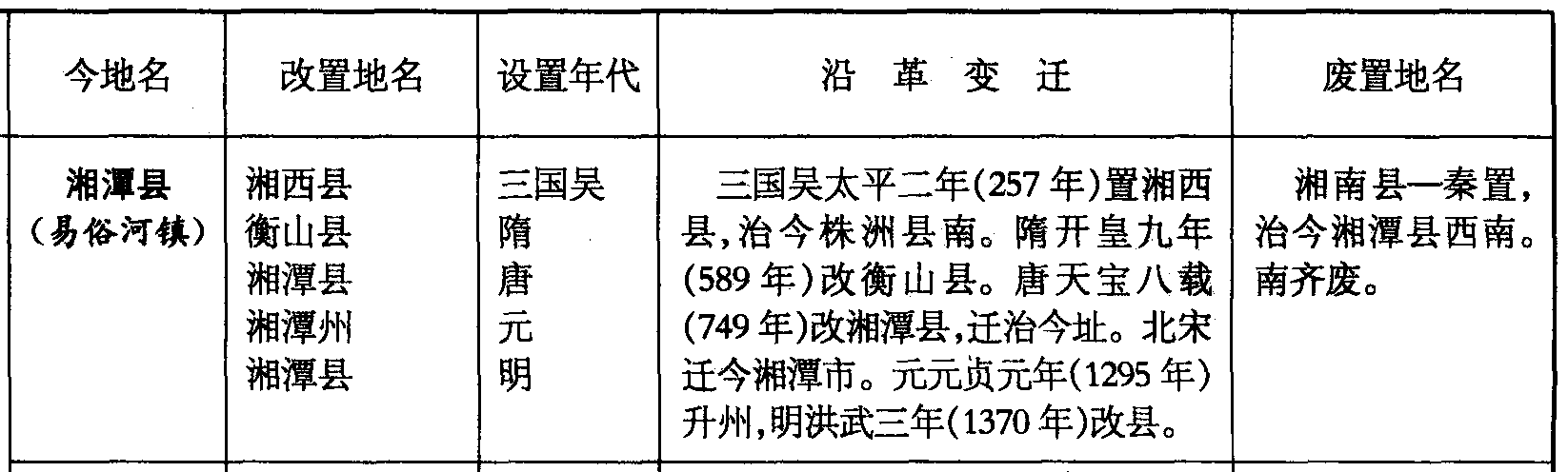 湘潭县(易俗河镇)湘西县衡山县湘潭县湘潭州湘潭县三国吴隋唐元明三国吴太平二年(257年)置湘西县,治今株洲县南。隋开皇九年(589年)改衡山县。唐天宝八载(749年)改湘潭县,迁治今址。北宋迁今湘潭市。元元贞元年(1295年)升州,明洪武三年(1370年)改县。湘南县—秦置,治今湘潭县西南。南齐废。