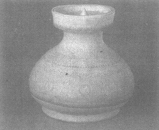 隋。通高14.2厘米,口径8.4厘米。北京故宫博物院藏。此壶是湖南湘阴窑的作品:盘口、溜肩、垂腹,整个器物给人以下坠之感。此器的优秀之处在于纹饰和釉色的表现。壶身共有3圈纹饰:肩部凹印三角纹一周;其下饰忍冬纹;腹部以团花与草叶纹相间的带状纹装饰。工匠巧妙地以忍冬纹——这种波曲状金银花、藤的艺术边饰联结并打破三角纹和团花纹的呆板,使整体纹饰在齐整中见活泼。壶的釉色淡雅莹亮,玻璃质感很强,釉面有细碎开片,积釉深处呈草绿色,近底处及足无釉。湖南省博物馆藏有与此类似的器物。