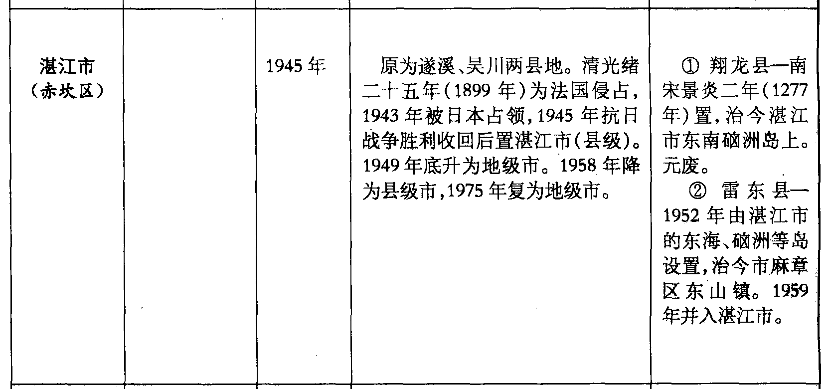湛江市(赤坎区)1945年原为遂溪、吴川两县地。清光绪二十五年(1899年)为法国侵占,1943年被日本占领,1945年抗日战争胜利收回后置湛江市(县级)。1949年底升为地级市。1958年降为县级市,1975年复为地级市。❶ 翔龙县—南宋景炎二年(1277年)置,治今湛江市东南硇洲岛上。元废。❷ 雷东县—1952年由湛江市的东海、硇洲等岛设置,治今市麻章区东山镇。1959年并入湛江市。