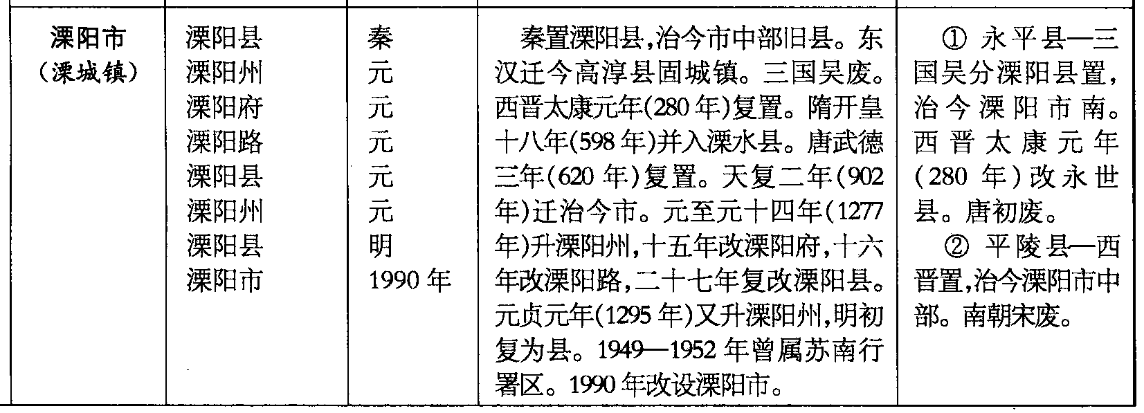 秦置溧阳县,治今市中部旧县。东汉迁今高淳县固城镇。三国吴废。西晋太康元年(280年)复置。隋开皇十八年(598年)并入溧水县。唐武德三年(620年)复置。天复二年(902年)迁治今市。元至元十四年(1277年)升溧阳州,十五年改溧阳府,十六年改溧阳路,二十七年复改溧阳县。元贞元年(1295年)又升溧阳州,明初复为县。1949—1952年曾属苏南行署区。1990年改设溧阳市。