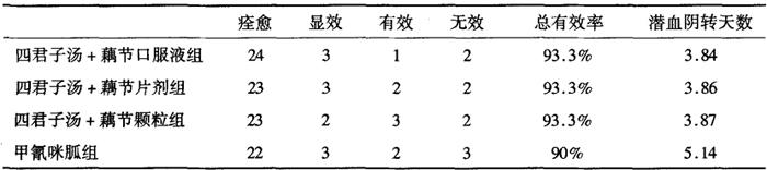 释义 | 人参 白术 茯苓 甘草 【中医理论】 人参(去芦)、白术、茯苓(去皮)、甘草(炙)各等份。又名四君子汤,载《太平惠民和剂局方》,用于脾胃气虚证。人参甘温益气,健脾养胃,白术苦温,健脾燥湿,加强益气助运之力,茯苓甘淡,健脾渗湿,苓、术合用,则健脾祛湿之功更显。炙甘草甘温,益气和中,调和诸药,四药配伍,共奏益气健脾之功,能使脾胃之气健旺,运化复常,资生气血,故为补气的基本方。后世以补气健脾为主的许多方剂,多从本方发展而来。如异功散为四君子汤加陈皮而成,芳香健脾醒胃,使甘温缓补更兼理气健脾之功。再加半夏为六君子汤,《名医方论》张璐言:“气虚者,补之以甘。参、术、苓、草,甘温益胃,有健运之功,具冲和之德,故为君子。益人之一身,以胃气为本,胃气旺,则五脏受荫;胃气伤,则百病丛生,故凡病久不愈,诸药不效者,惟有益胃补肾两途,故用四君子随证加减。”也临床实际应用有以党参代人参使用,也称四君子汤。 【药理研究】 1.显微鉴别 取本品丸剂,置显微镜下观察:不规则分枝状团块无色,遇水合氯醛液溶化;菌丝无色或淡棕色,直径4~6μm。联结乳管直径12~15μm,含细小颗粒状物。草酸钙针晶细小,长10~32μm,不规则地充塞于薄壁细胞中,纤维束周围薄壁细胞含草酸钙方晶,形成晶纤维[1]。 2.薄层色谱鉴别 2.1 四君子丸中白术的薄层色谱鉴别方法 取丸剂2g,研碎,加正己烷10ml,超声处理15min,滤过,滤液挥干,残渣加正己烷1ml使溶解,作为供试品溶液。另取白术对照药材0.2g,加正己烷2ml,同法制成对照药材溶液。照薄层色谱试验,吸取上述制备的两种溶液各10μl,分别点于同一硅胶G薄层板上,以石油醚(60~90℃)-醋酸乙酯(20∶0.1)为展开剂,展开,取出,晾干,喷以5%香草醛硫酸溶液,热风吹至斑点显色清晰。供试品色谱中,在与对照药材色谱相应的位置上,显相同颜色的斑点[1]。 2.2 四君子丸中甘草酸薄层色谱鉴别方法 取丸剂5g,研碎,加水40ml,煎煮30min,滤过,滤液用正丁醇振摇提取3次,每次15ml,合并正丁醇液,用水洗涤3次,每次10ml,正丁醇液蒸干,残渣加甲醇0.5ml使溶解,作为供试品溶液。另取甘草对照药材0.5g,同法制成对照药材溶液。照薄层色谱法试验,吸收供试品溶液4μl,对照药材溶液1μl,分别点于同一用1%氢氧化钠溶液制备的硅胶G薄层板上,以醋酸乙酯-甲酸-冰醋酸-水(15∶1∶1∶2)为展开剂,展开,取出,晾干,喷以10%硫酸乙醇溶液,在105℃烘至斑点显色清晰,置紫外光灯(365nm)下检视。供试品色谱中,在与对照药材色谱相应的位置上,显相同颜色的荧光斑点。 2.3 四君子汤薄层扫描特征指纹图谱的研究[2] 张莅峡等选用了薄层扫描中的三种检测方式:荧光检测,紫外光检测,可见光检测(包括显色前后的测定),在同一块层离板上,可以同时获得四种不同的四君子汤的薄层扫描的特征峰指纹图谱。通过单味药与成药进行阴阳双对照,可以确认白术、甘草和党参的存在。四君子汤提取液:按处方标示量,分别称取经粉碎(过40目筛)的四种单味药,混匀后,放入磨口三角瓶中,加一定量的95%乙醇溶液,将磨口三角瓶置于超声清洗器中,超声1.5h后,将药液与药渣转移至离心管中,进行离心分离,分取上清液置具塞容器中,备用(表12-3-1)。阴、阳对照液的制备:按处方(中国药典一部)比例称取一定量。分别在各种阴、阳对照品中,加入一定量乙醇,参照上述四君子汤提取相同的提取方法提取,超声,离心,分取上清液备用。 表12-3-1 四君子汤阴、阳对照液的制备(单位g) 4组病例在年龄、病情等方面基本相同,具可比性。 治疗方法:藕节合剂3种剂型每剂均含藕节生药6g,田三七1.5g。3种剂型均按常规工艺制备。口服液组,每日4次,每次10ml。片剂组,每日4次,每次3片。颗粒组,每日4次,每次1.6g。以上3组均同时给予口服四君子汤(党参30g,白术、茯苓各15g,甘草6g)煎剂,每日1剂。甲氰咪胍组,每日2次,每次0.6g,加入输液中。轻、中度出血者,每天输液1,000~1,500ml,重度出血者并给予输血300~600ml。疗效评定标准:按全国血证急症协作组制定的标准。痊愈:1周内吐血或黑便停止,大便潜血试验阴性。显效:1周内吐血或黑便停止,大便潜血试验(+)。有效:1周内出血减少,大便潜血试验( 表2-3-63 四君子汤治疗吐血、便血的疗效 各治疗组与对照组总有效率基本相同,P>0.05;治疗组各组止血时间基本相同,P>0.05;但与对照组甲氰米胍组的止血时间比较有极显著差异,P<0.01。 本方加用锌制剂治疗小儿厌食症效好[131]。 4.辅助治疗癌症 腹泻是消化道肿瘤术后常见的并发症之一,严重地影响著术后病人的康复,同时也消弱了机体抗癌能力。本病用抗生素类药物多难奏效,杨氏用半夏泻心汤合四君子汤治疗43例均获痊愈。43例中男32例,女11例;最大年龄68岁,最小年龄34岁;贲门癌11例,胃癌18例,食管癌7例,肠癌7例;病史最长1.5年,最短2个月;腹泻少者日2次,多者日3~5次;服药时间短者1周,长者2个月,一般为4周。43例病人均为服用抗生素类药物而未能治愈者。治疗方法:用半夏泻心汤合四君子汤:清半夏10g,干姜10g,黄连10g,黄芩6g,大枣3枚,炒白术10g,茯苓15g,太子参15g,甘草10g。日1剂,水煎服。服中药期间停服其他止泻药物。治疗结果:腹泻停止、大便成形后,随访1个月未复发者为治愈。43例病人均治愈[132]。 另有报道用本方结合化疗、放疗或手术治疗肺癌、肝癌、胃癌、癌前病变等报道[133~137]。 5.治疗脾虚体弱 以四君子汤为基础加减治疗小儿感染后脾虚综合